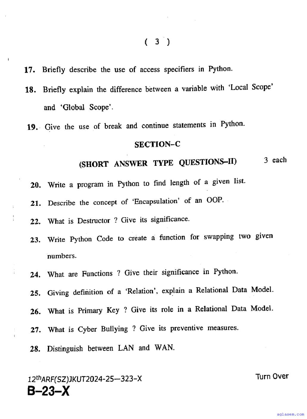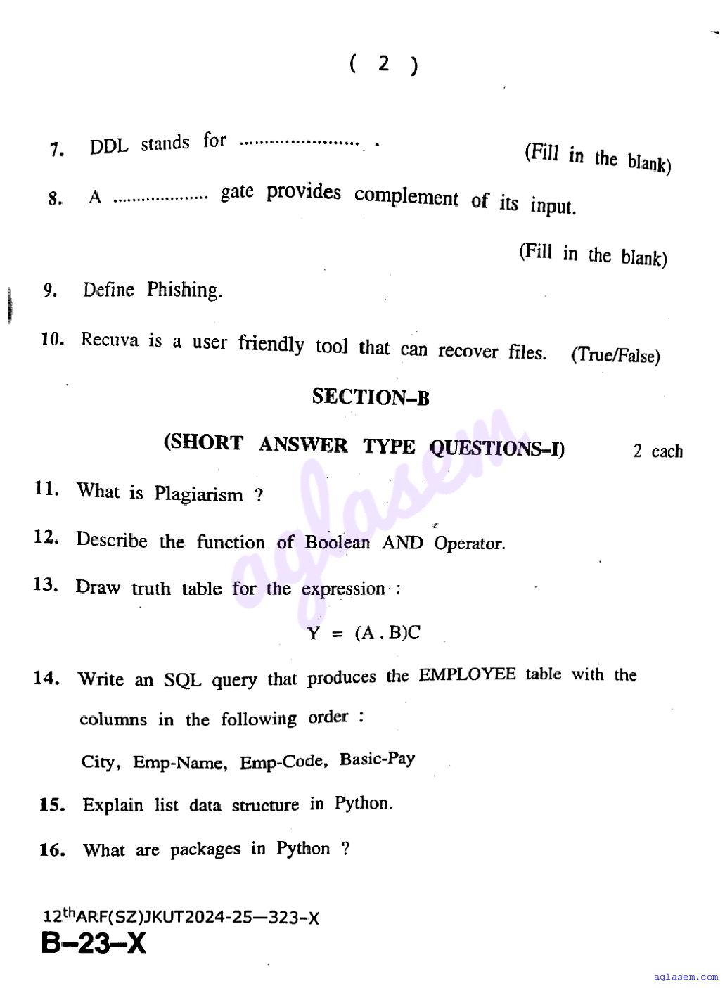 The JKBOSE question paper for class 12 Computer Science is as follows.
