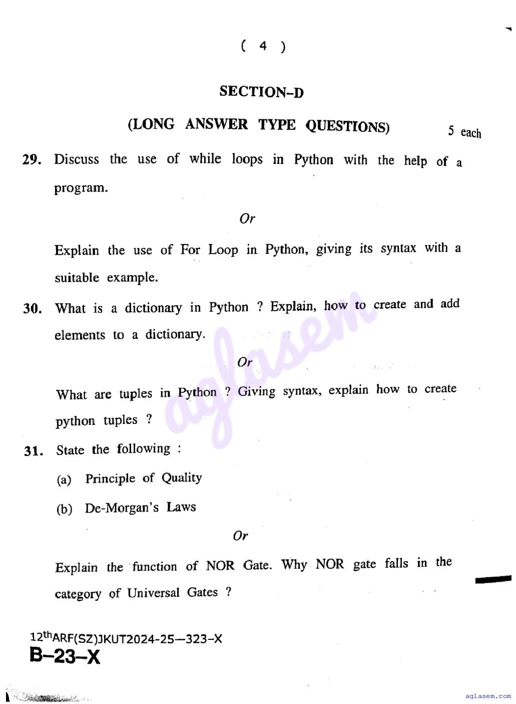JKBOSE Class 12th Question Paper 2025 Computer Science View Download