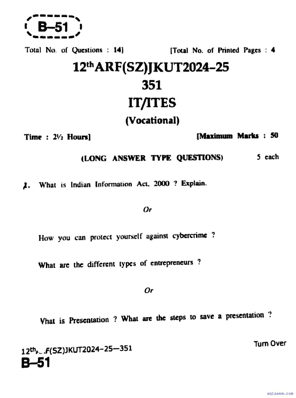 | Educational Resource Here | Jammu and Kashmir Board Old Papers of Class 12 IT ITES |