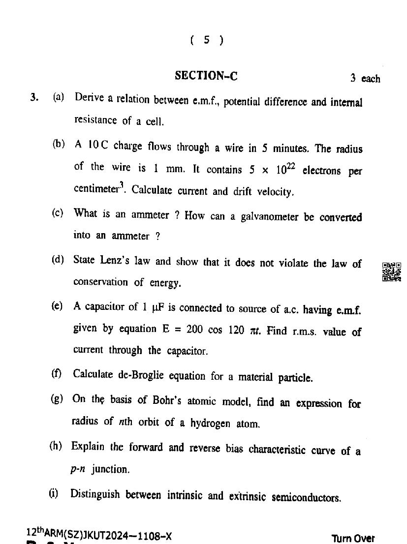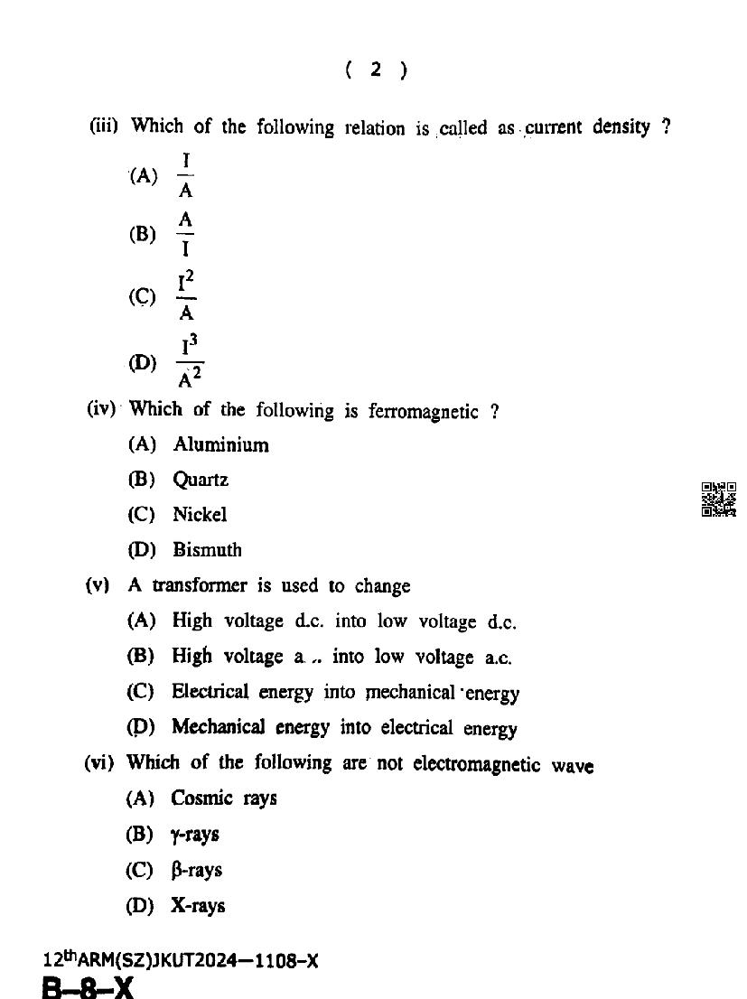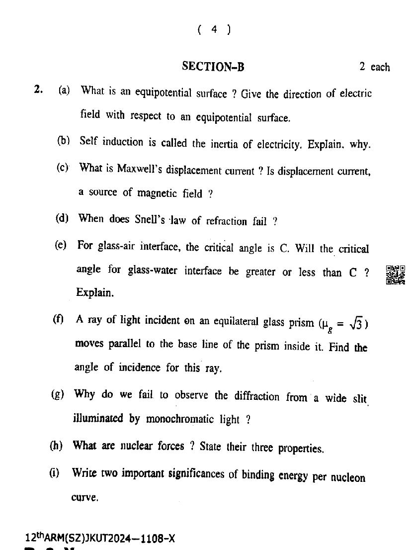 JKBOSE 12th Question Paper 2024 Physics View Download