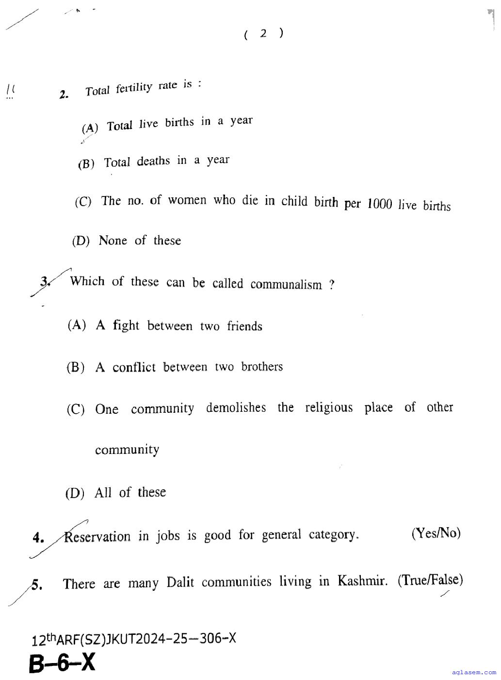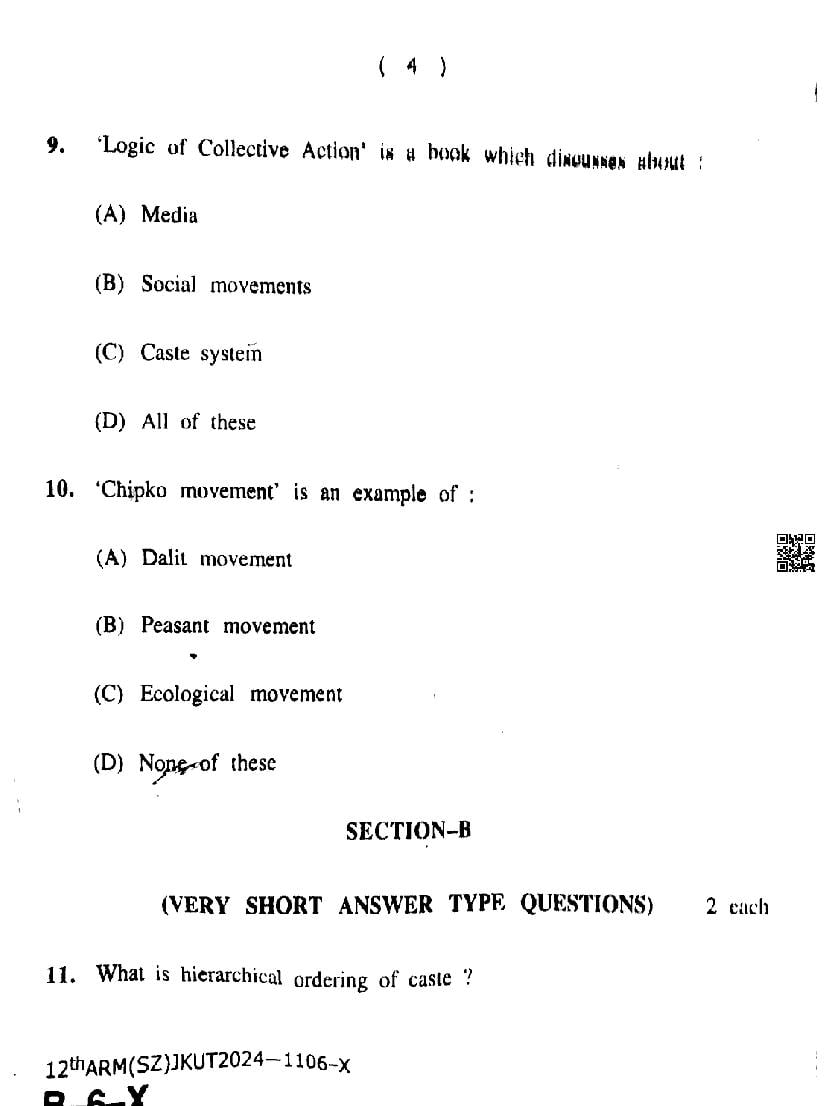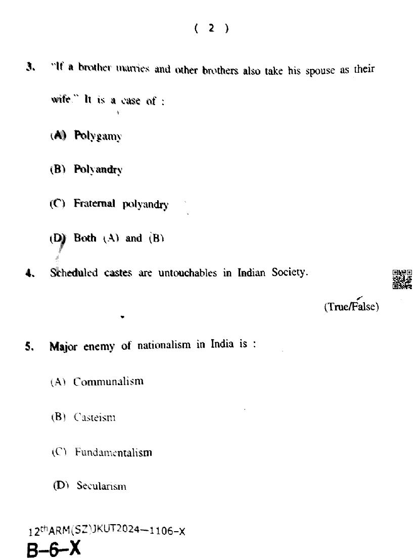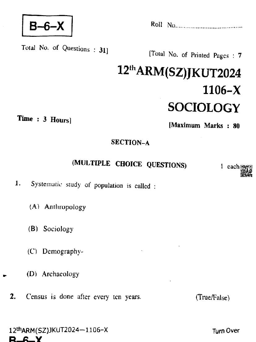 The JKBOSE question paper for class 12 Sociology is as follows.
