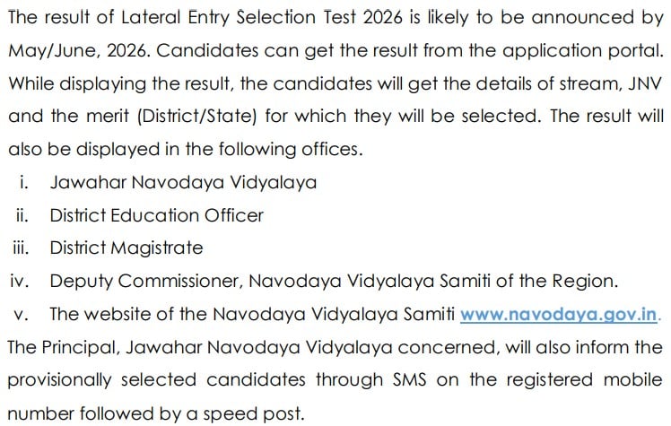 | JNV Class 11th Lateral Entry Admission Result Date | May / June 2026 |