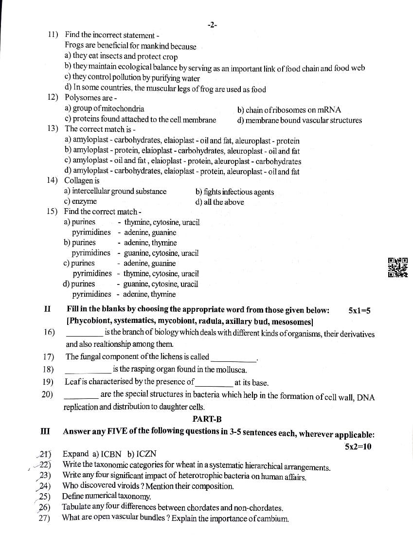 The Karnataka Board Question Paper for Biology mid term exam is as follows.