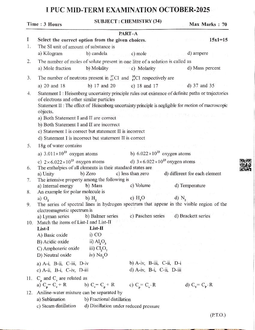Karnataka 1st PUC Mid Term Question Paper 2025 Chemistry View Download