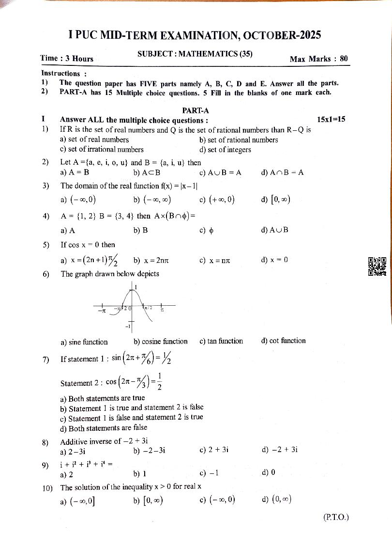 Karnataka 1st PUC Mid Term Question Paper 2025 Maths View Download
