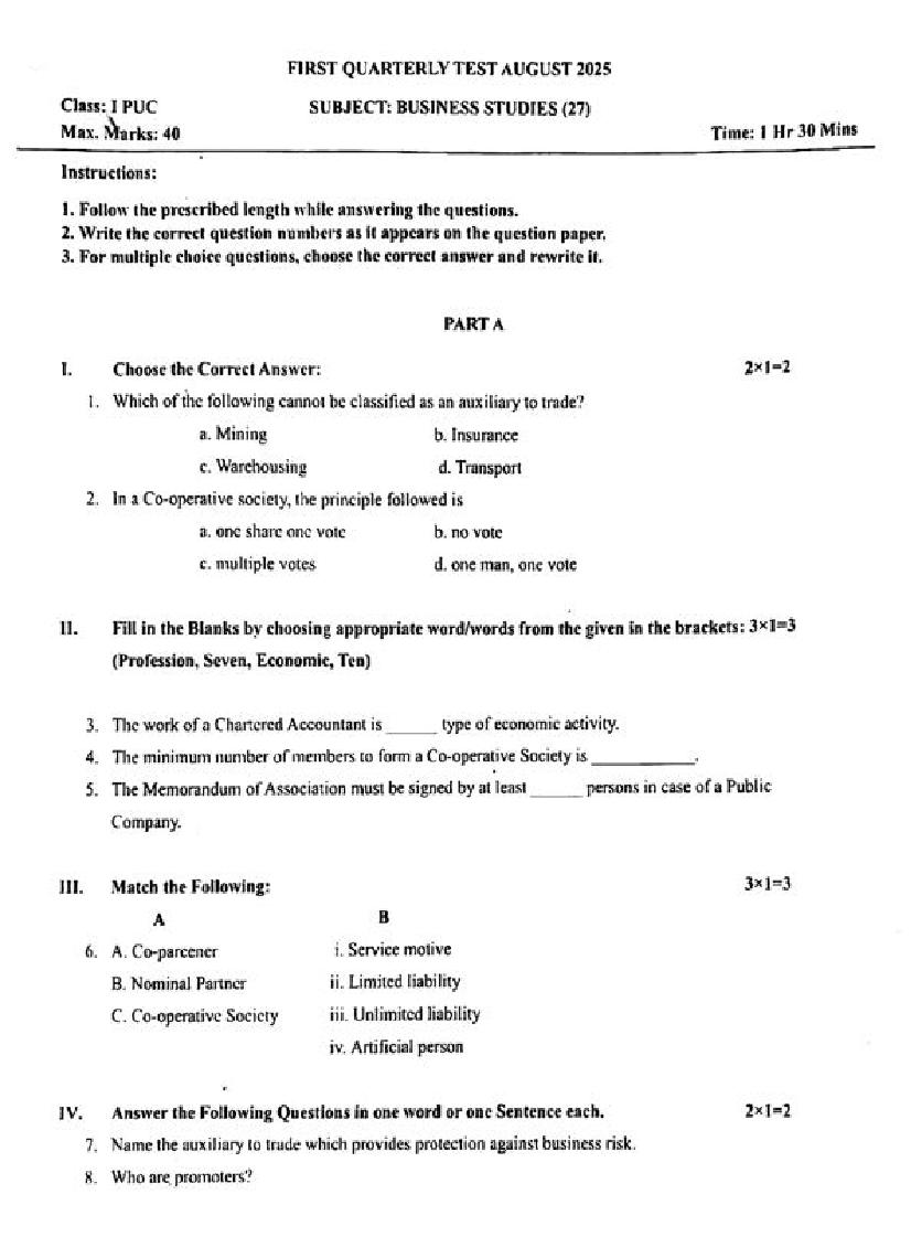 Karnataka 1st PUC Quarterly Exam Business Studies Question Paper 2025 PDF Download Link – Click Here to Download Question Paper PDF