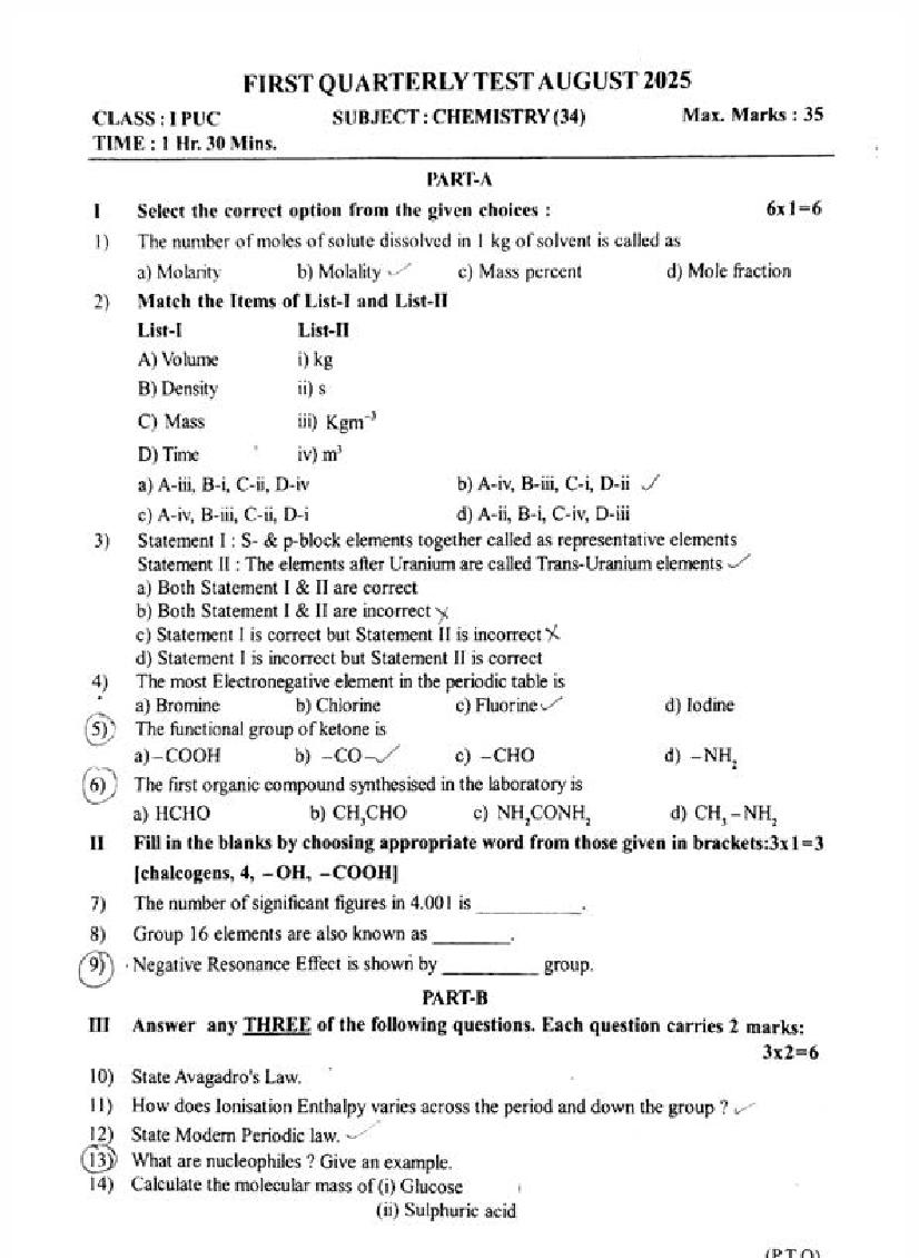 | Material | Karnataka 1st PUC Quarterly Exam Question Paper of Chemistry |
