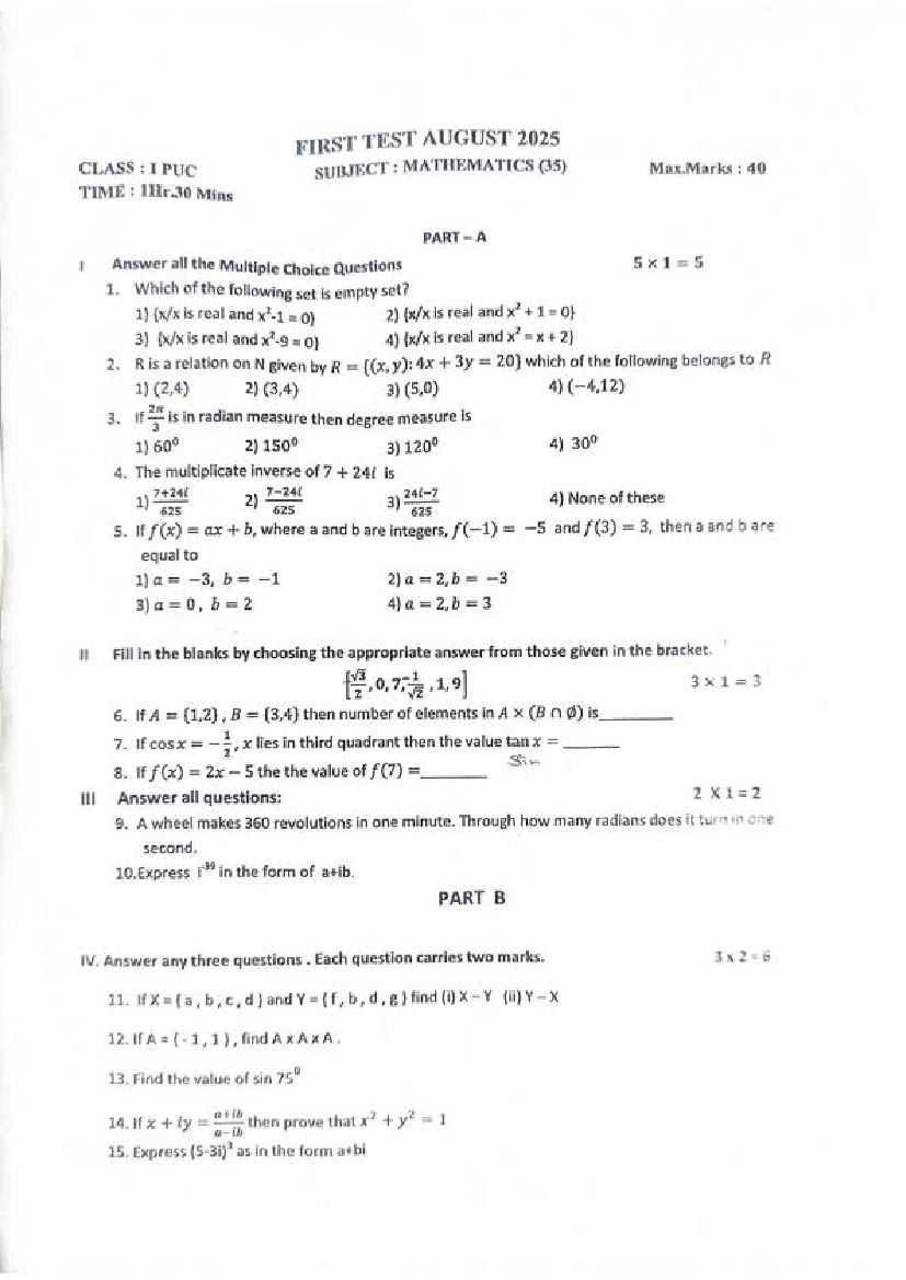 Karnataka 1st PUC Quarterly Exam Question Paper 2025 Mathematics View Download