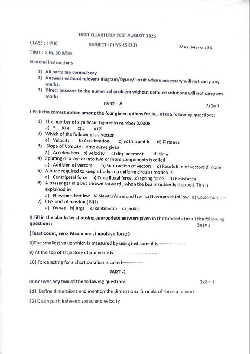 Karnataka 1st PUC Quarterly Exam Physics Question Paper 2025 PDF Download Link – Click Here to Download Question Paper PDF