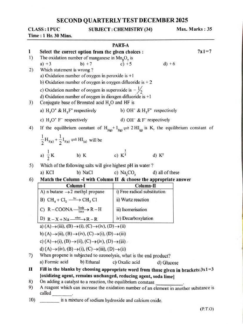 Karnataka 1st PUC Chemistry Second Test Question Paper 2026 is available after exam. Now one can download 1st PUC Second Test December 2026 exam Chemistry question paper PDF from here on aglasem. The Karnataka 1st PUC Second Test Question Paper of Chemistry has those questions which were asked by Pre-University Course college from class 11 Chemistry syllabus in the second quarterly test december month.