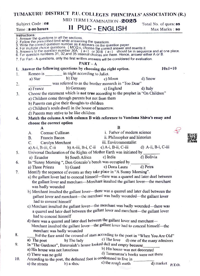 Karnataka 2nd PUC English Mid Term Question Paper 2025