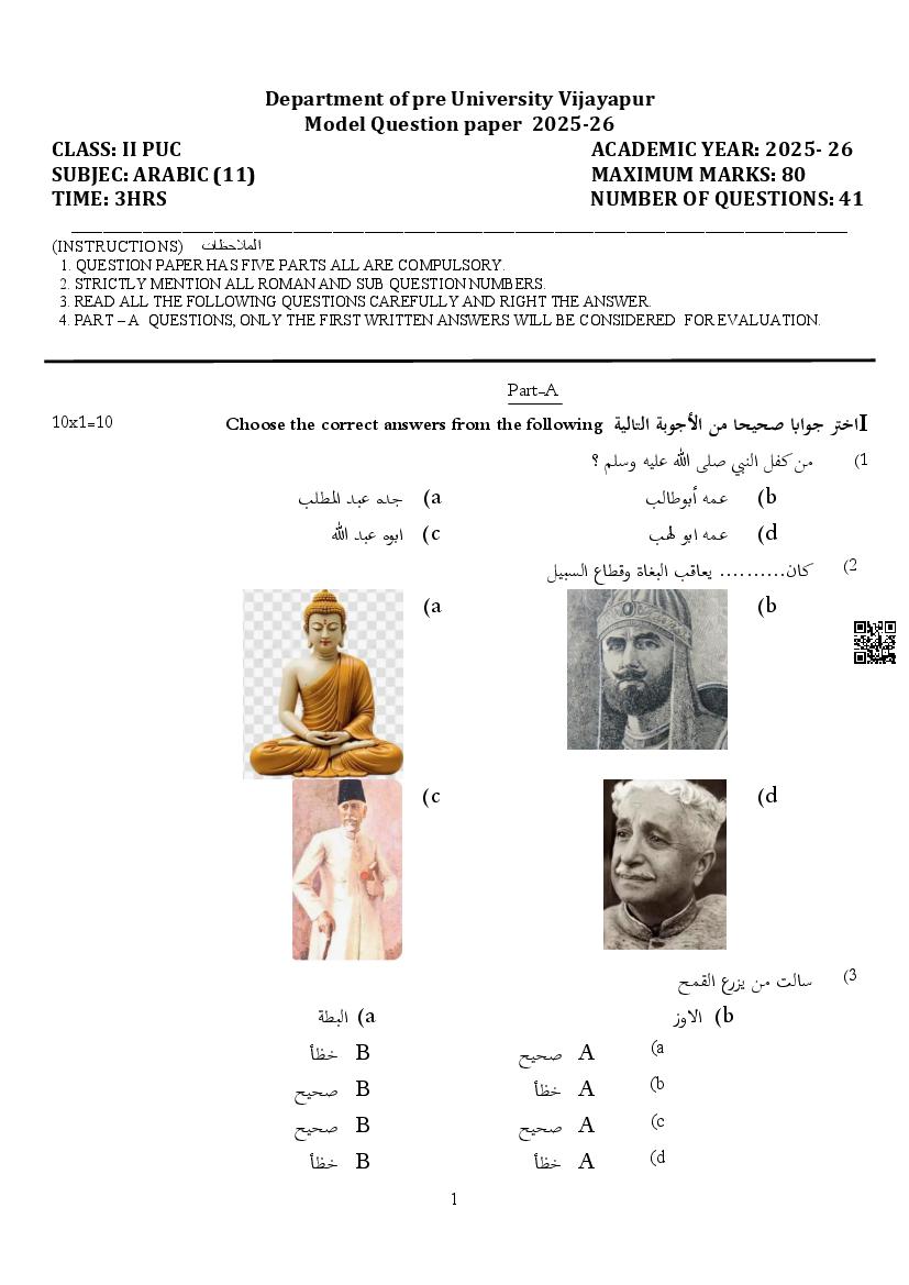 Karnataka 2nd PUC Model Question Paper 2026 for Arabic View Download