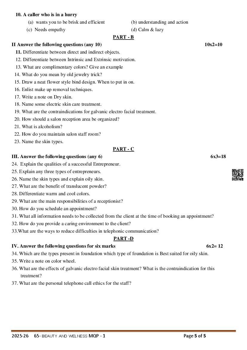 The Karnataka Board Model Paper for class 12 (2nd PUC) Beauty And Wellness is as follows.
