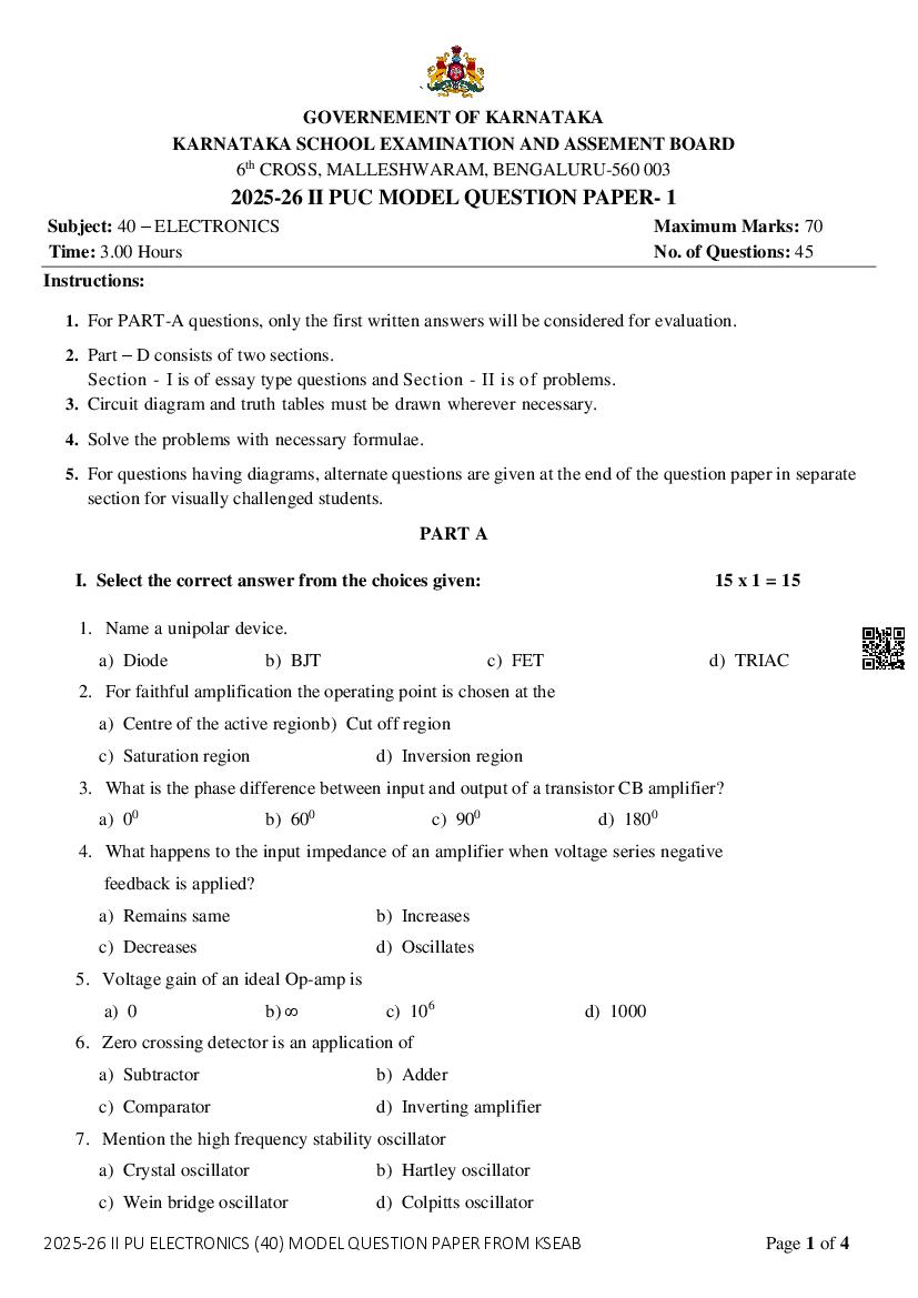 Karnataka 2nd PUC Electronics Model Question Paper 2026 has been released by KSEAB, DPUE. You can download the Karnataka Class 12 Electronics Sample Question Paper PDF from here on aglasem. This Karnataka 2nd PUC Model Question Paper contains specimen questions for Electronics subject based on latest Electronics syllabus. Therefore by solving this 2nd PUC Electronics model question paper, you can aim to score high marks in the class 12 board exams of Karnataka Board.