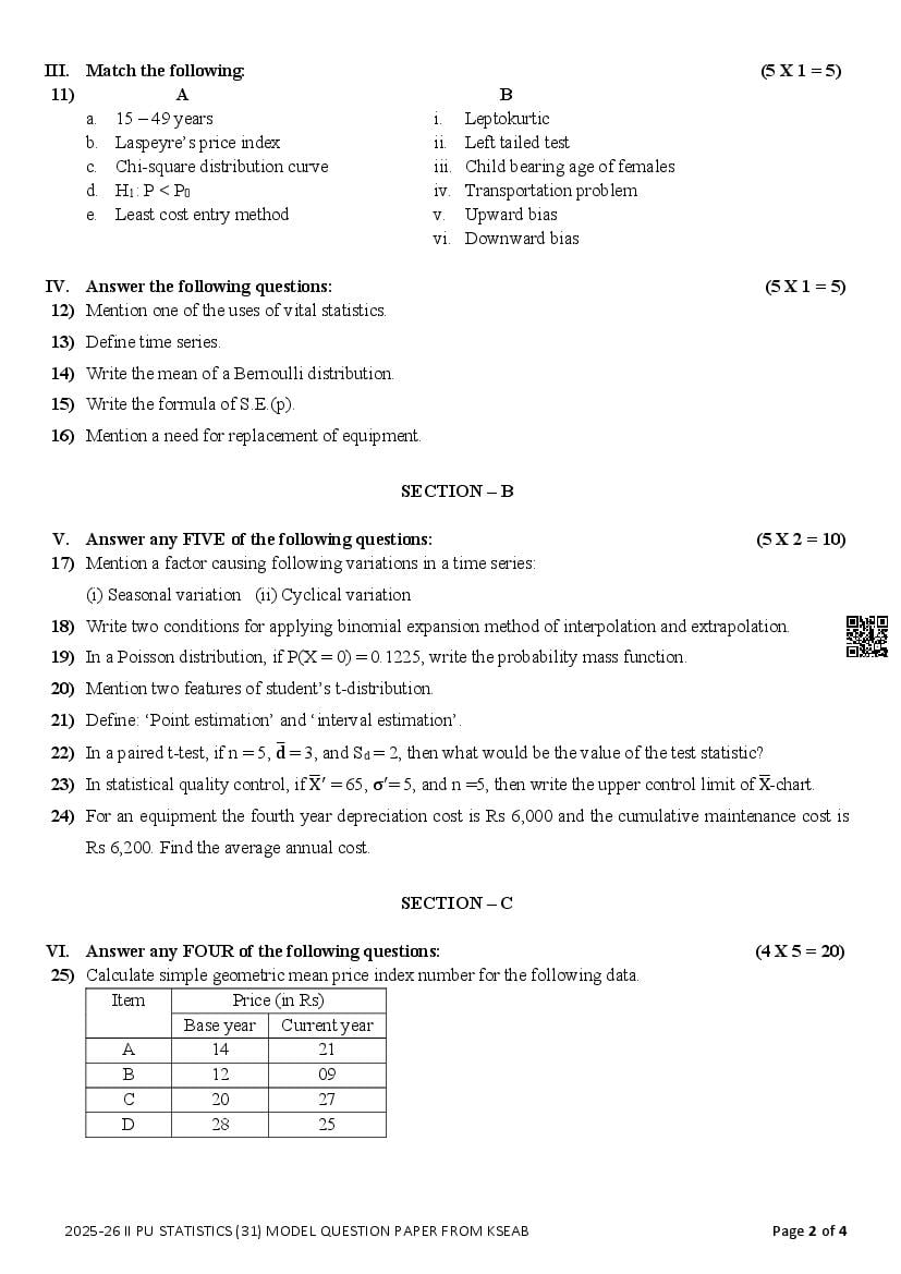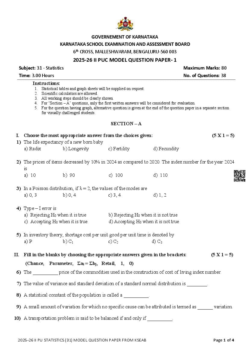 Karnataka 2nd PUC Statistics Model Question Paper 2025 PDF Download Link – Click Here to Download Model Paper PDF