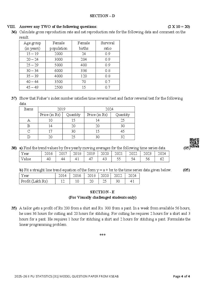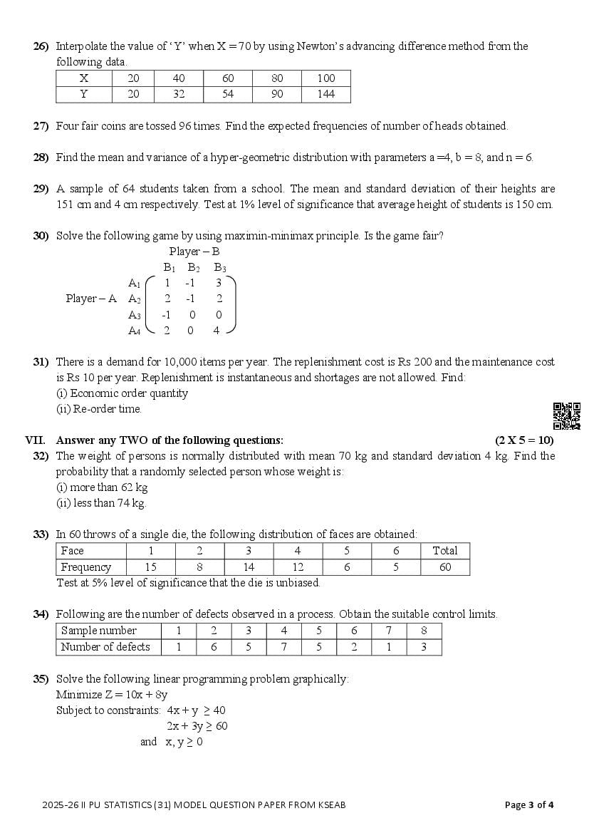Karnataka 2nd PUC Statistics Model Question Paper 2026