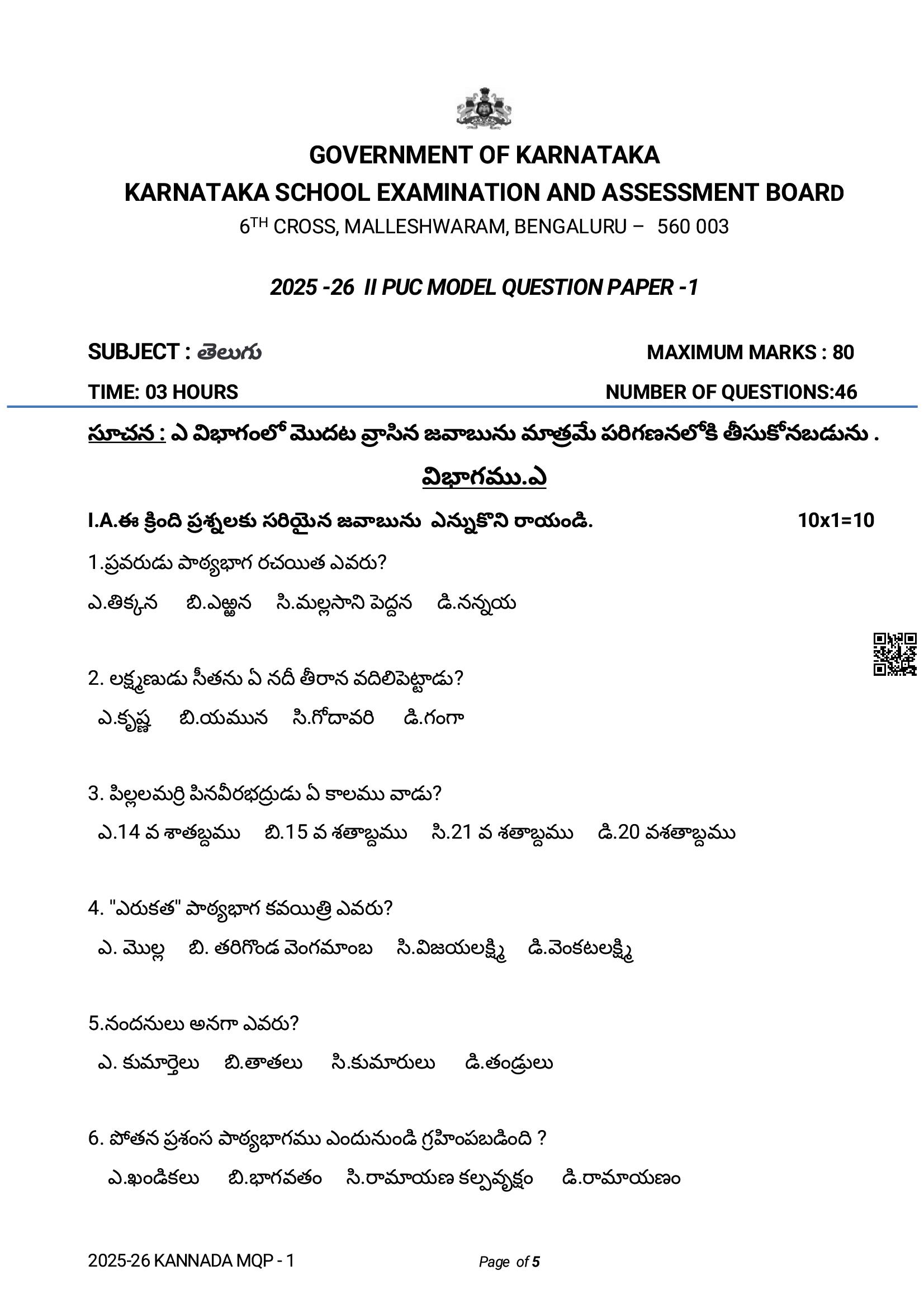 Karnataka 2nd PUC Model Question Paper 2026 for Telugu View Download
