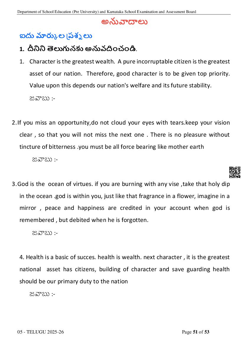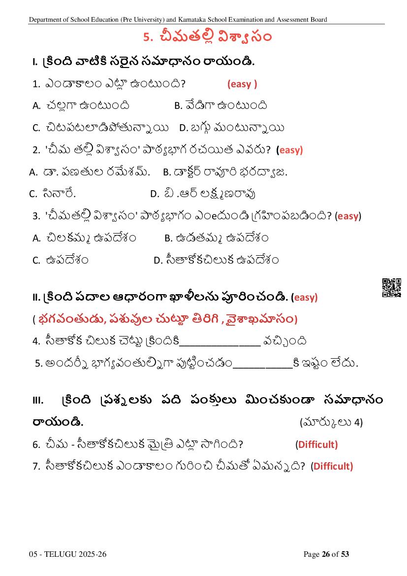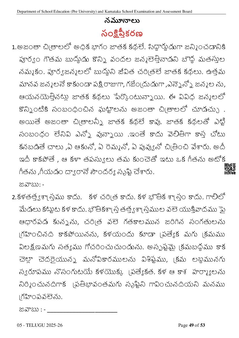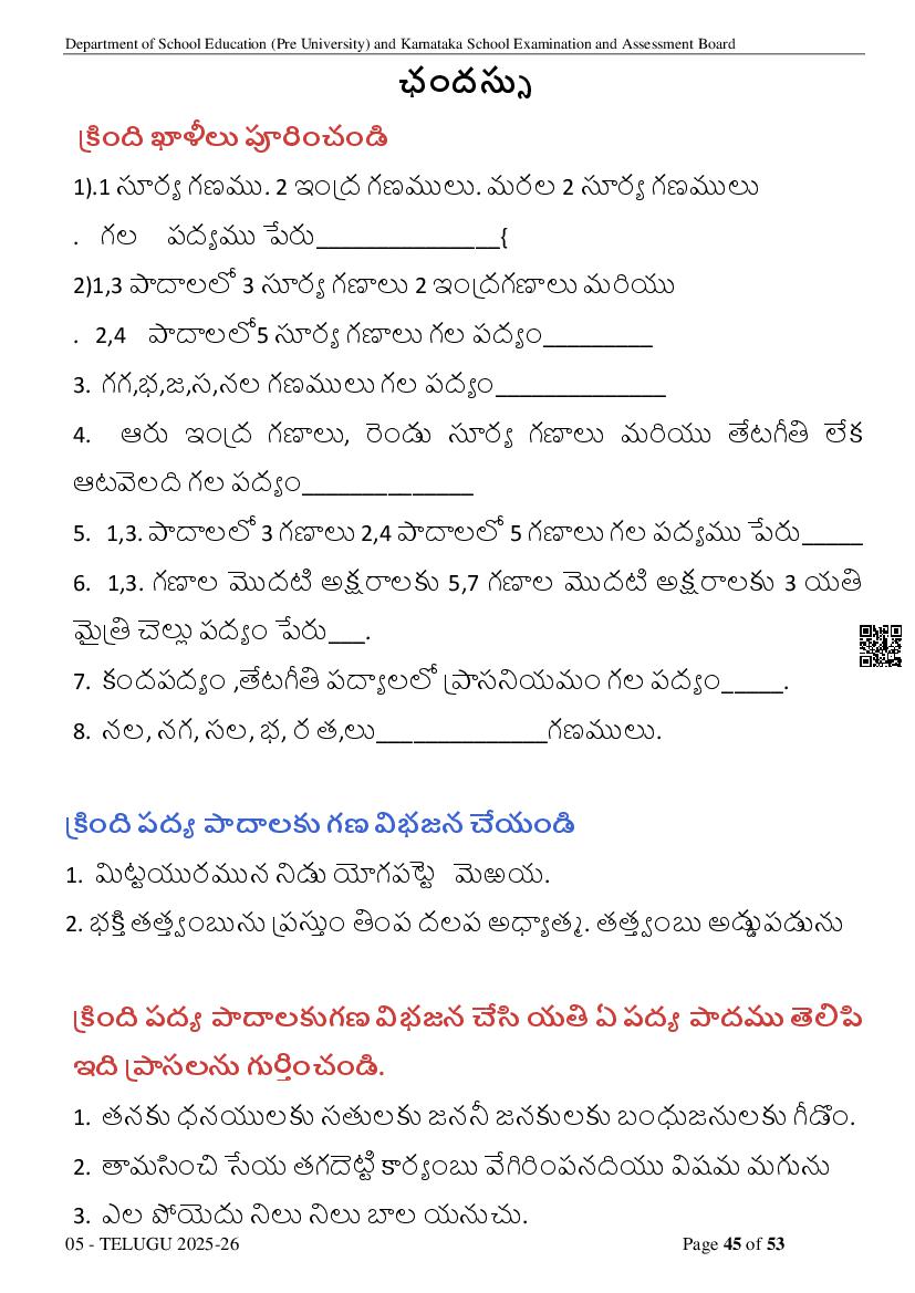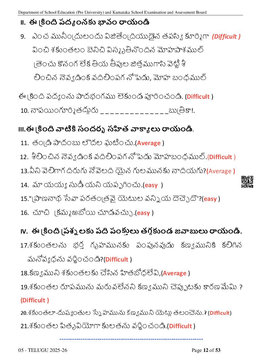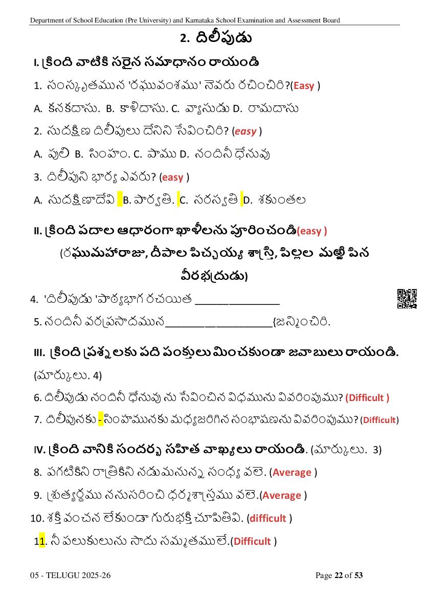 Karnataka 2nd PUC Question Bank for Telugu View Download
