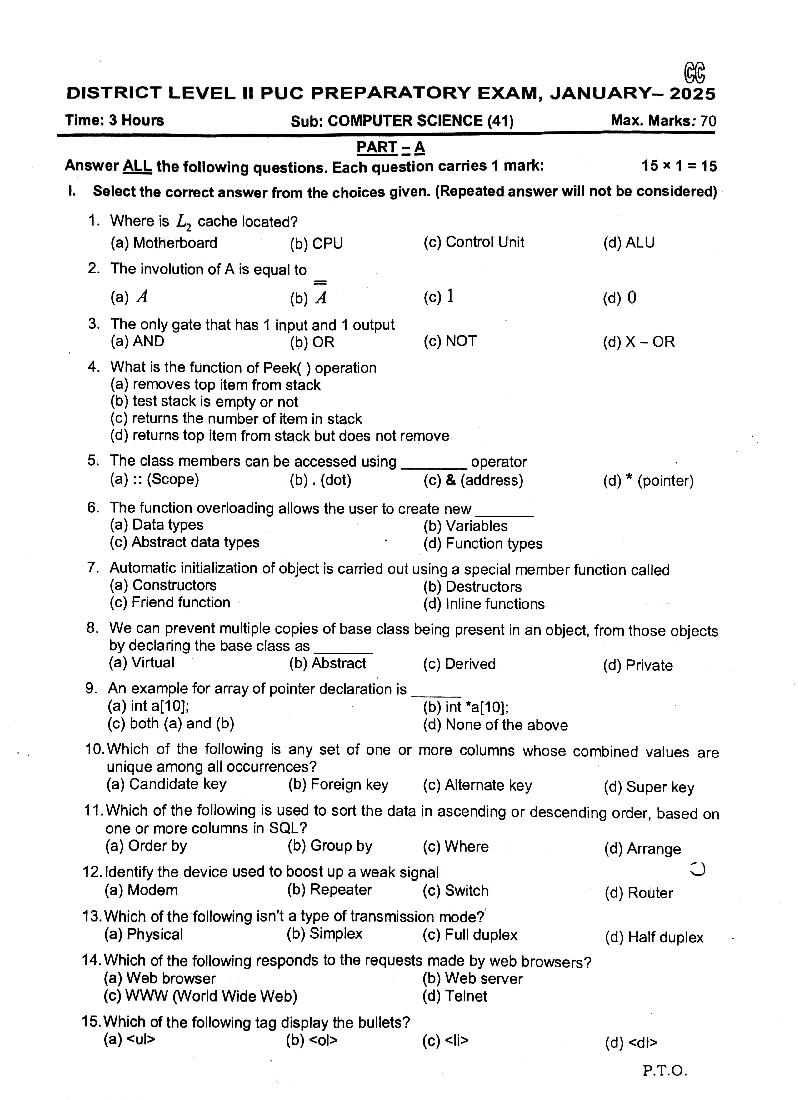 The question paper for 2nd PUC preparatory exam of 2026 shall be available once exam ends. In the meantime you can prepare for this test with the previous year’s Computer Science question paper given below.
