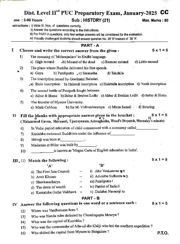 Karnataka 2PUC Preparatory Exam Question Paper 2025 History View Download