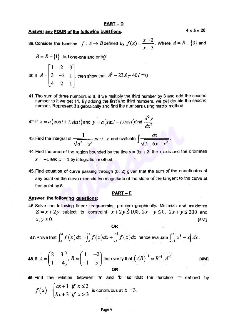 The Karnataka question paper for 2nd PUC Class 12 Preparatory Exam for Maths is as follows.