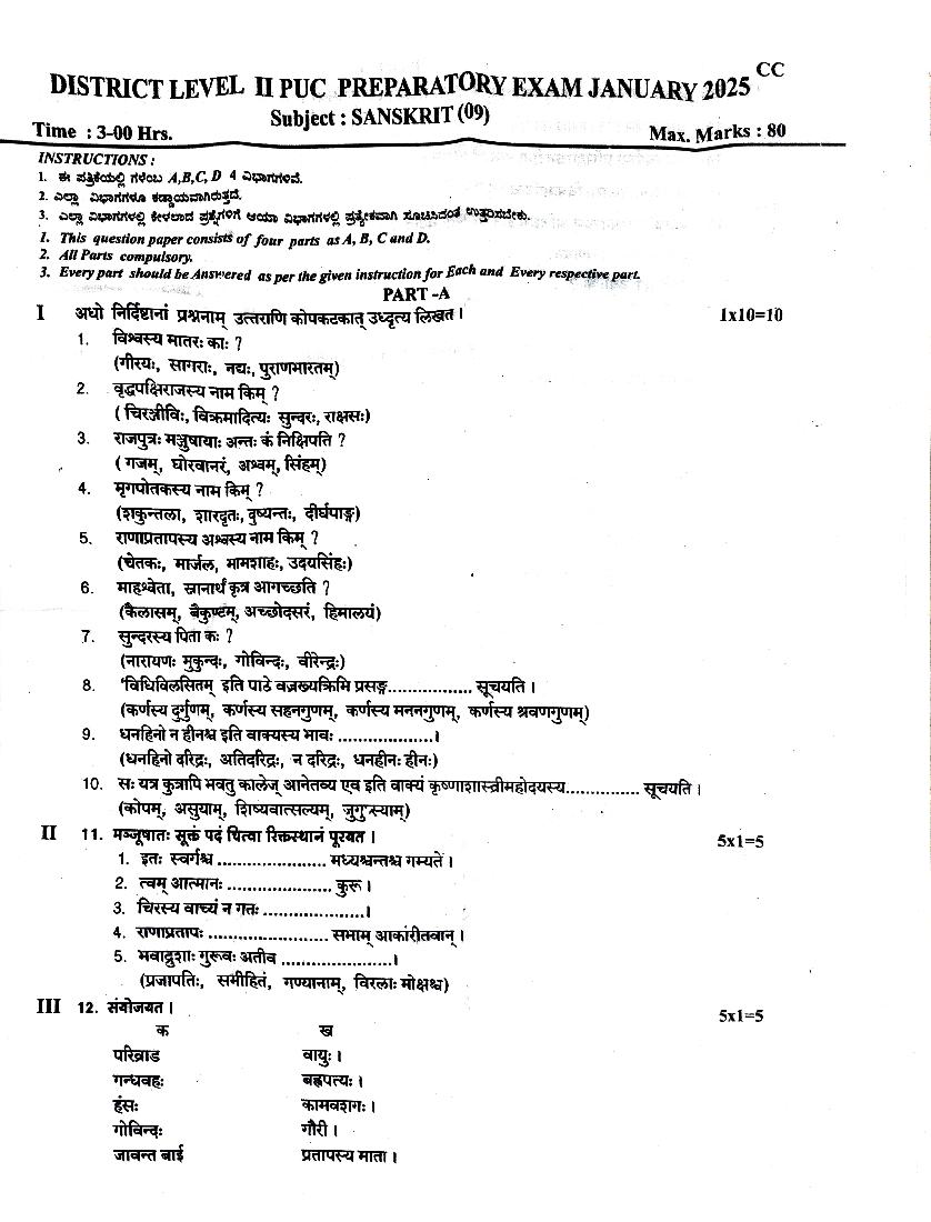 Karnataka 2nd PUC Sanskrit Preparatory Question Paper 2025 – Click Here to download Question Paper PDF
