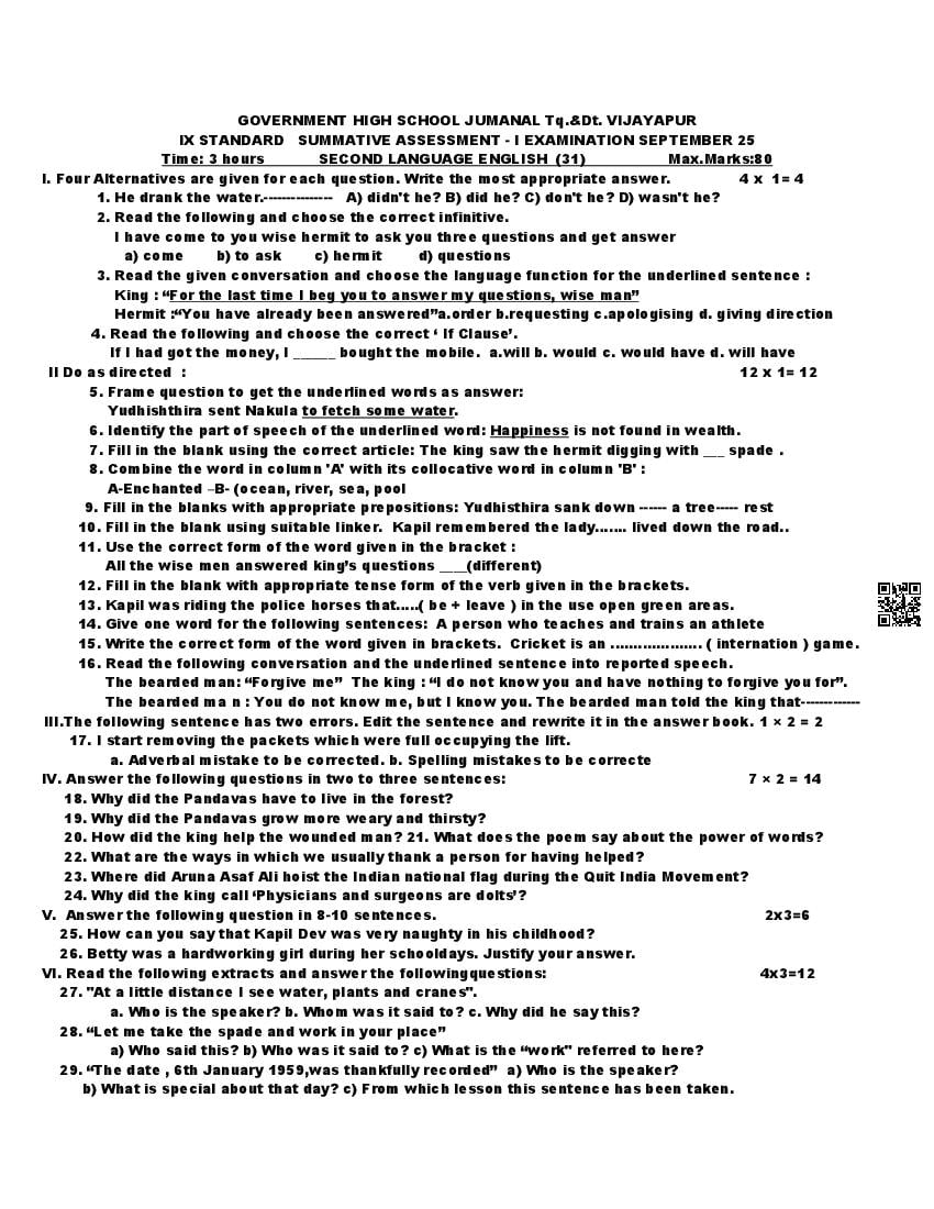 Karnataka 9th Class English SAq Question Paper 2025