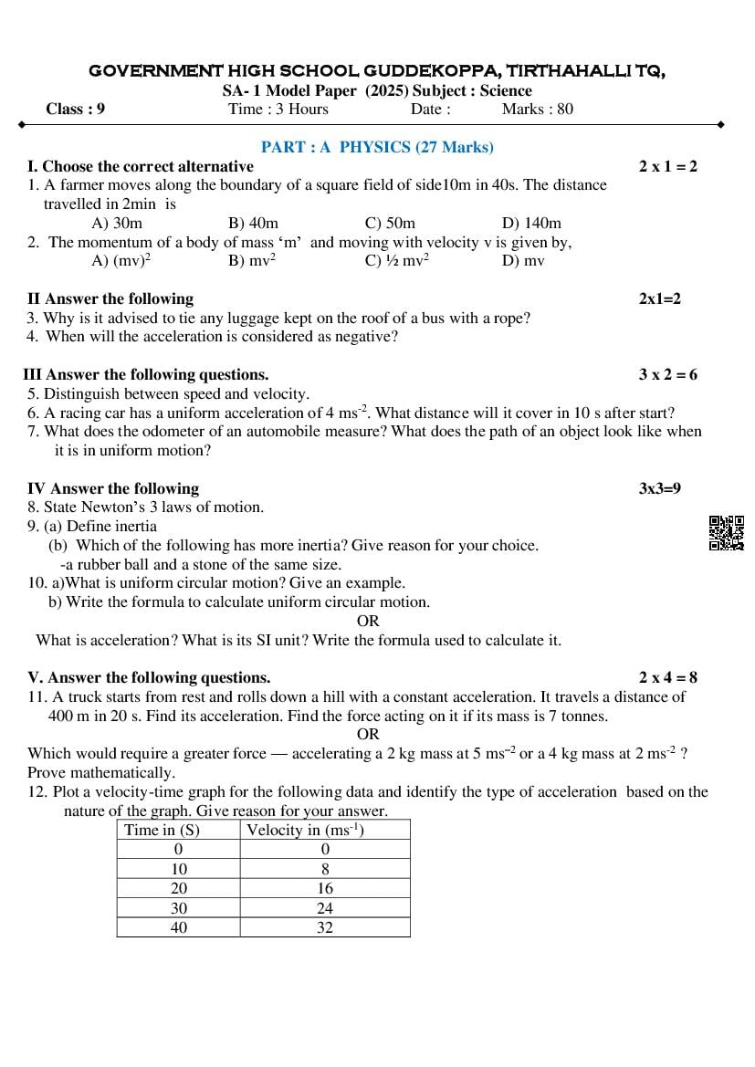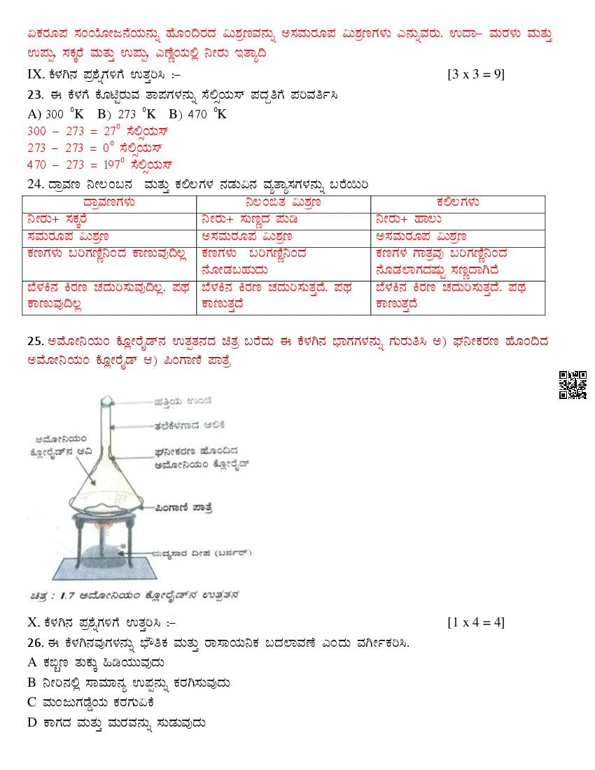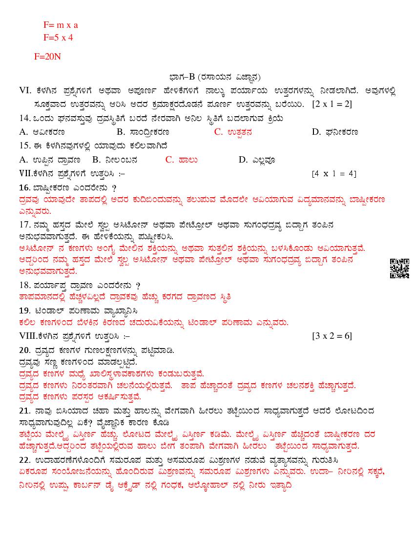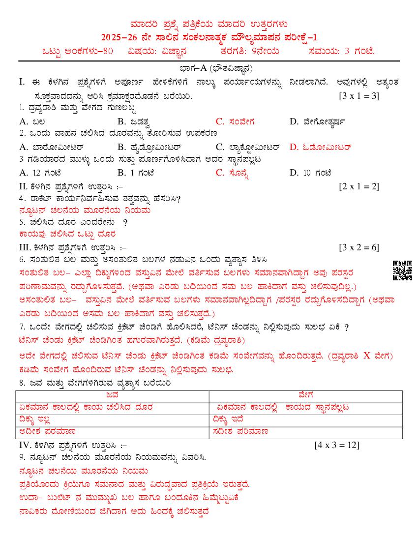Karnataka 9th Class Science SAq Question Paper 2025