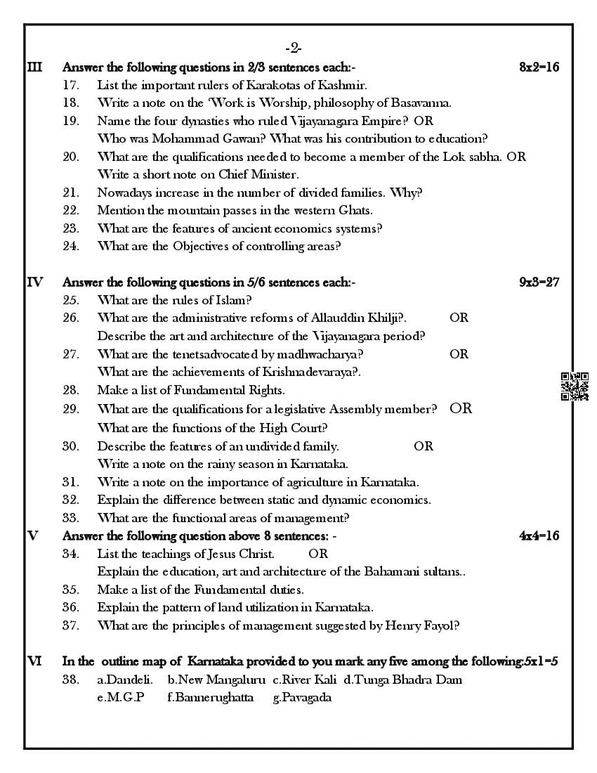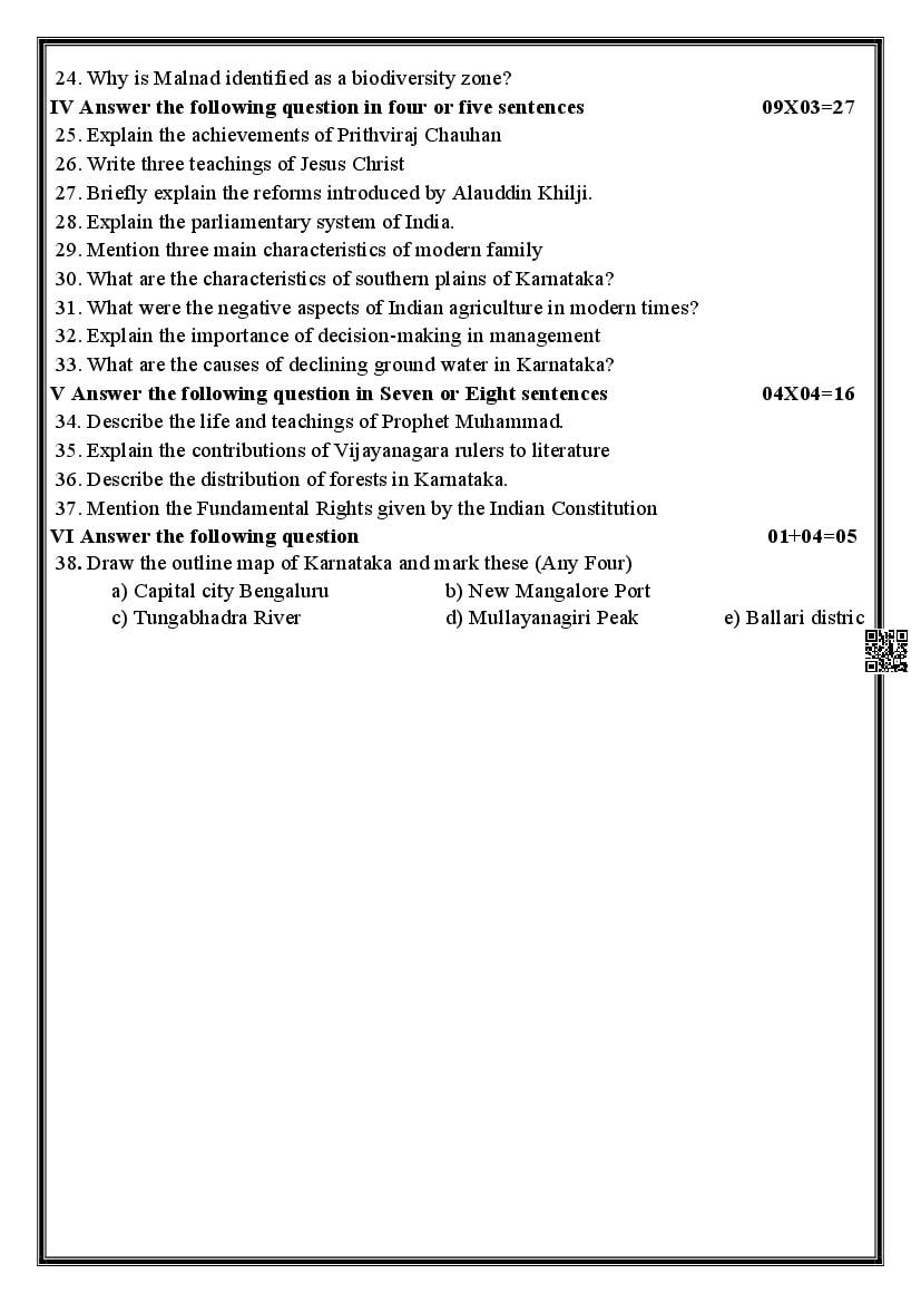 Karnataka 9th Class Social Science SAq Question Paper 2025