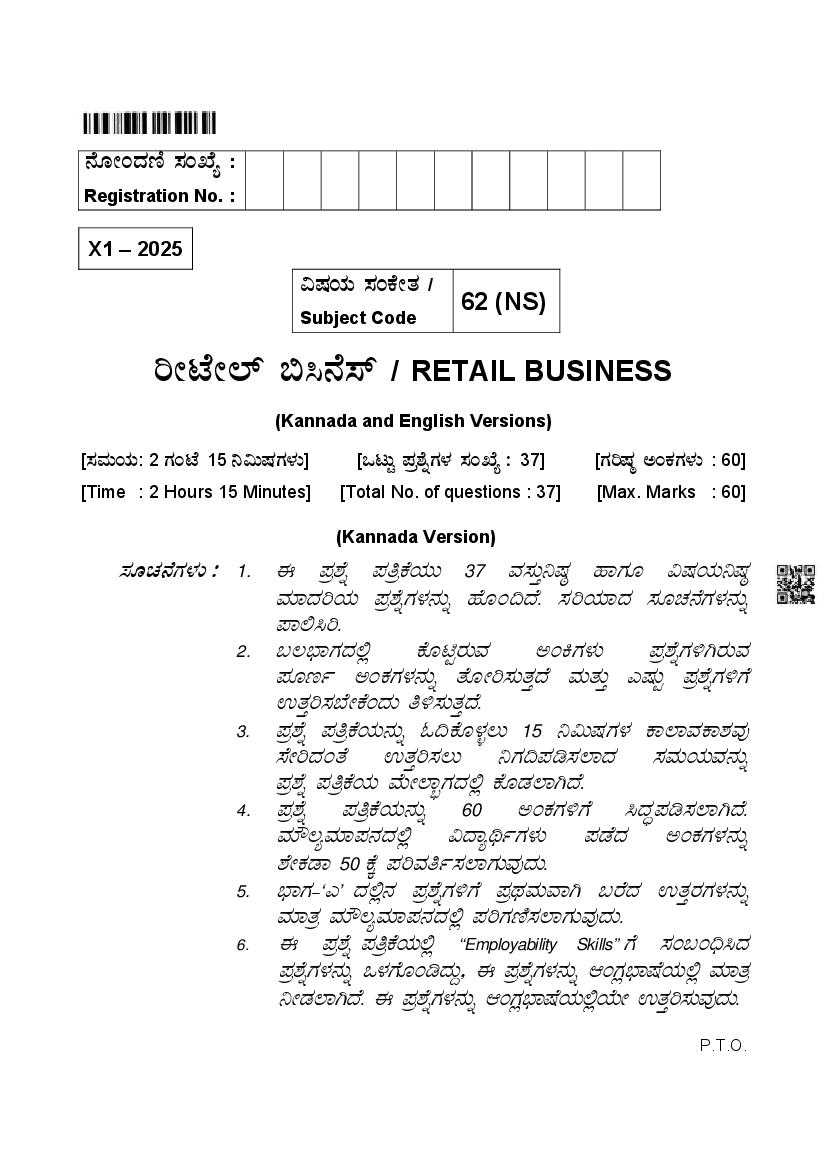 Karnataka 2nd PUC Retail Business Question Paper 2025