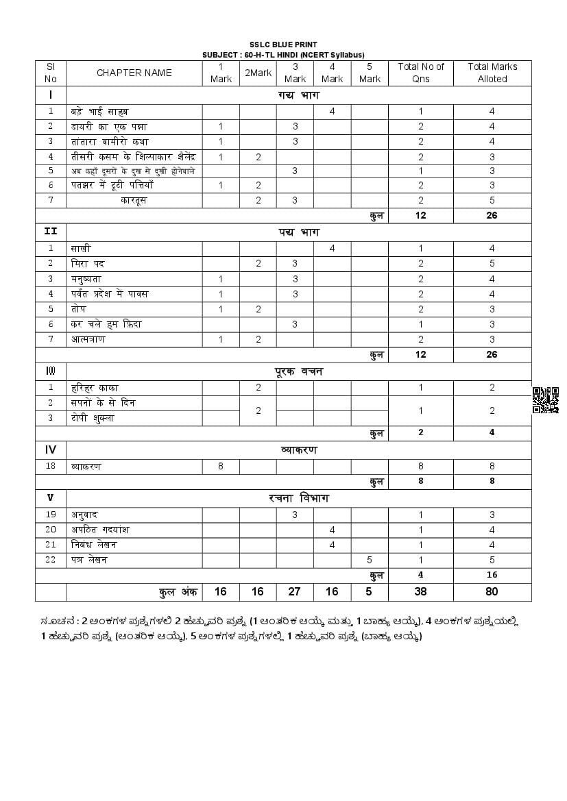 Karnataka SSLC Blueprint 2026 for Hindi View Download