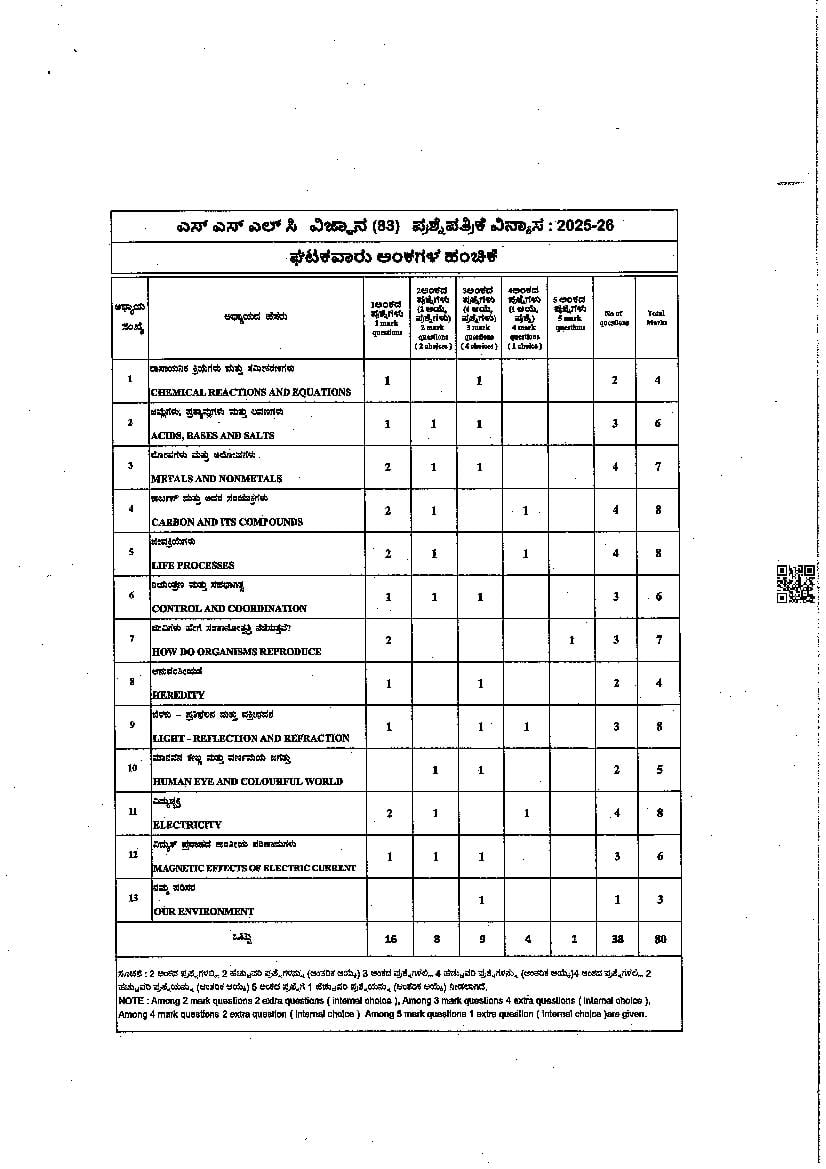 Karnataka SSLC Blueprint 2026 for Science View Download