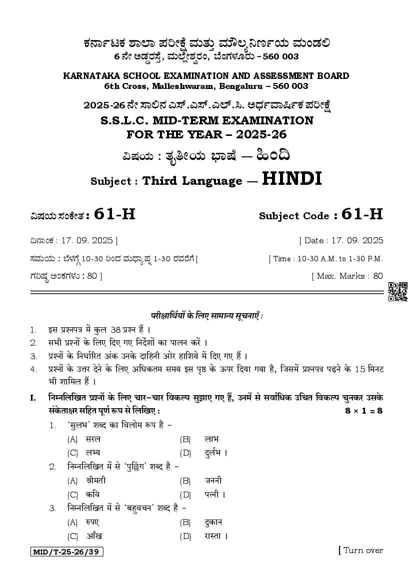 Karnataka SSLC Mid Term Question Paper 2025 Hindi Third Language View Download