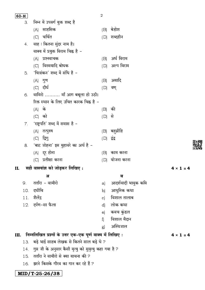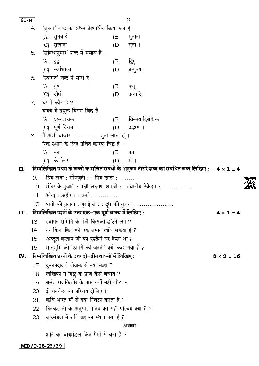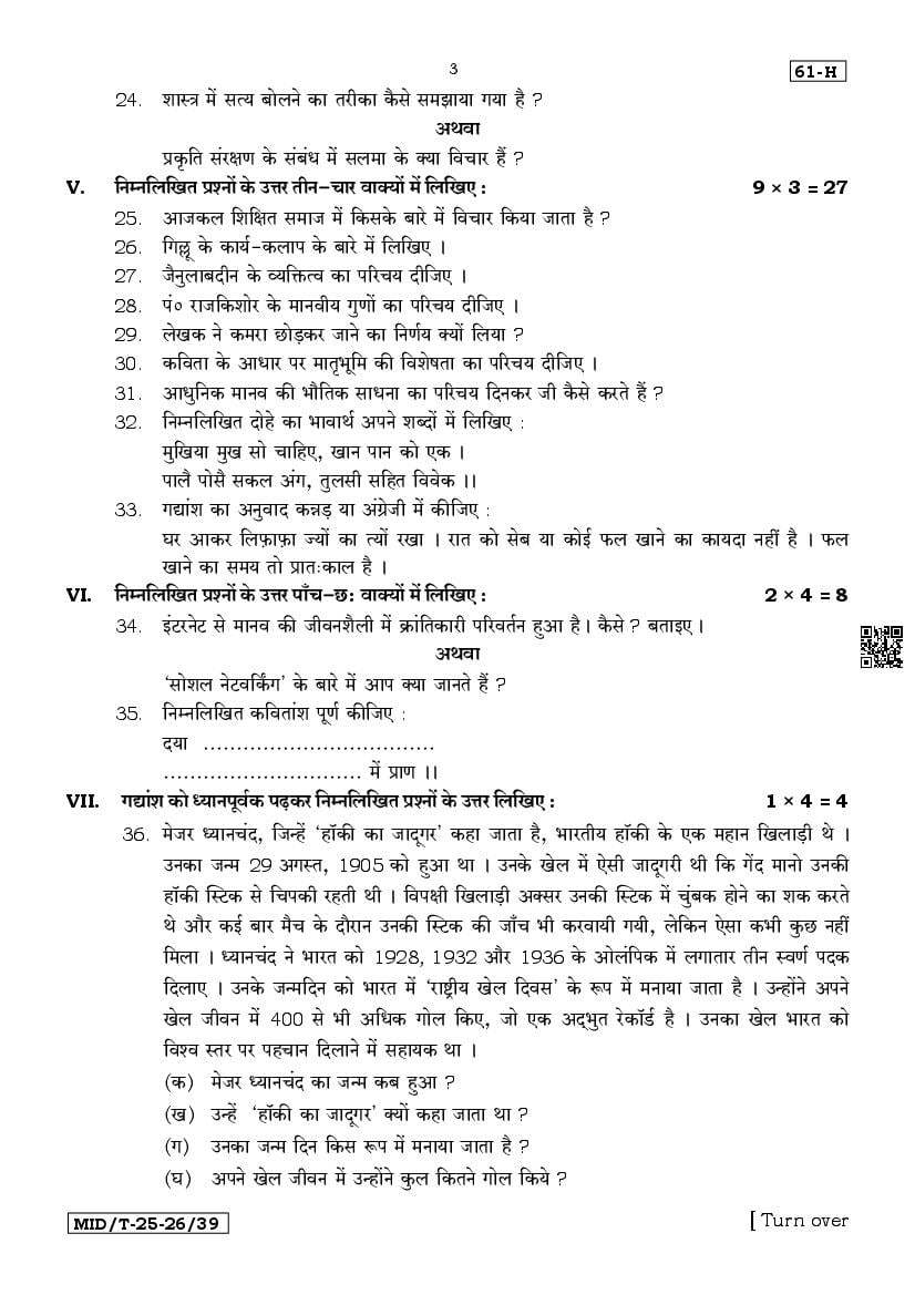 The latest available complete Hindi Third Language mid term exam question paper is as follows.