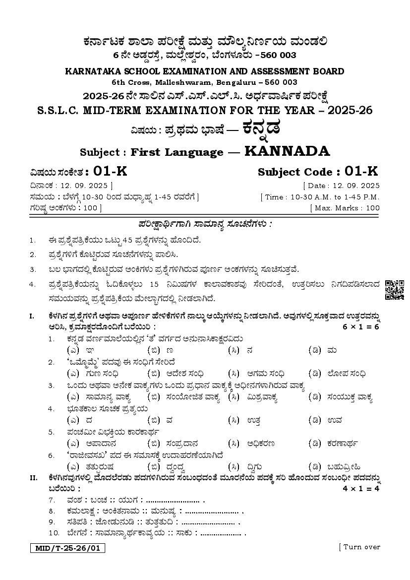 Karnataka SSLC Mid Term Question Paper 2025 Kannada First Language View Download