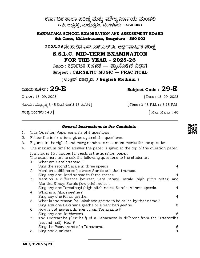 Karnataka SSLC Karnatic Music Mid Term Question Paper 2025