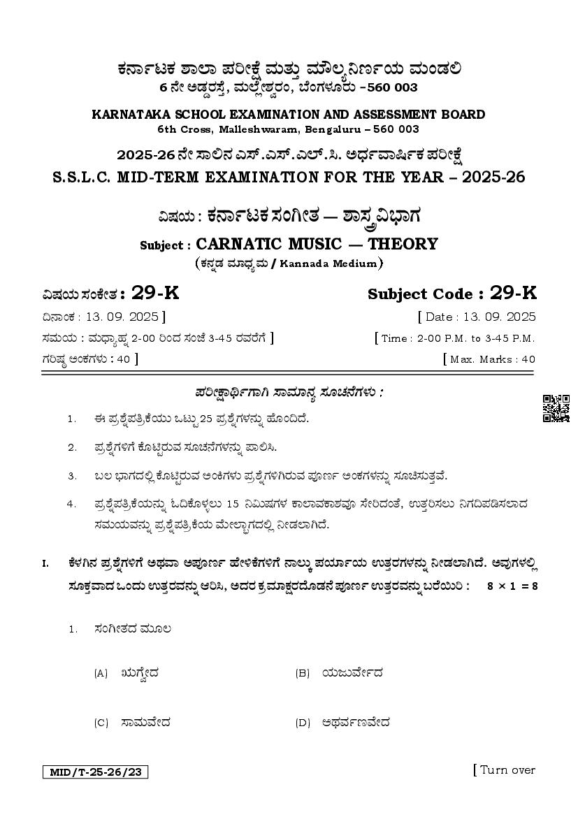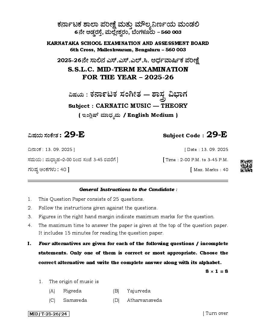 Karnataka SSLC Mid Term Question Paper 2025 Karnatic Music View Download