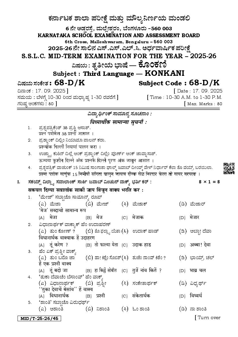 Karnataka SSLC Mid Term Question Paper 2025 Konkani Third Language View Download