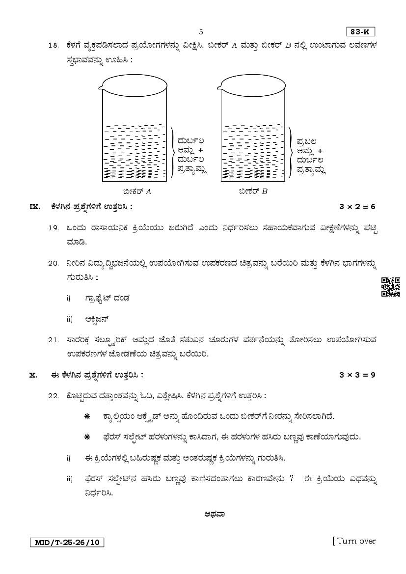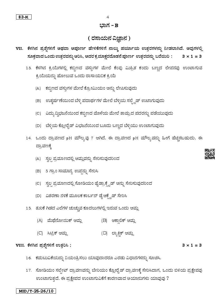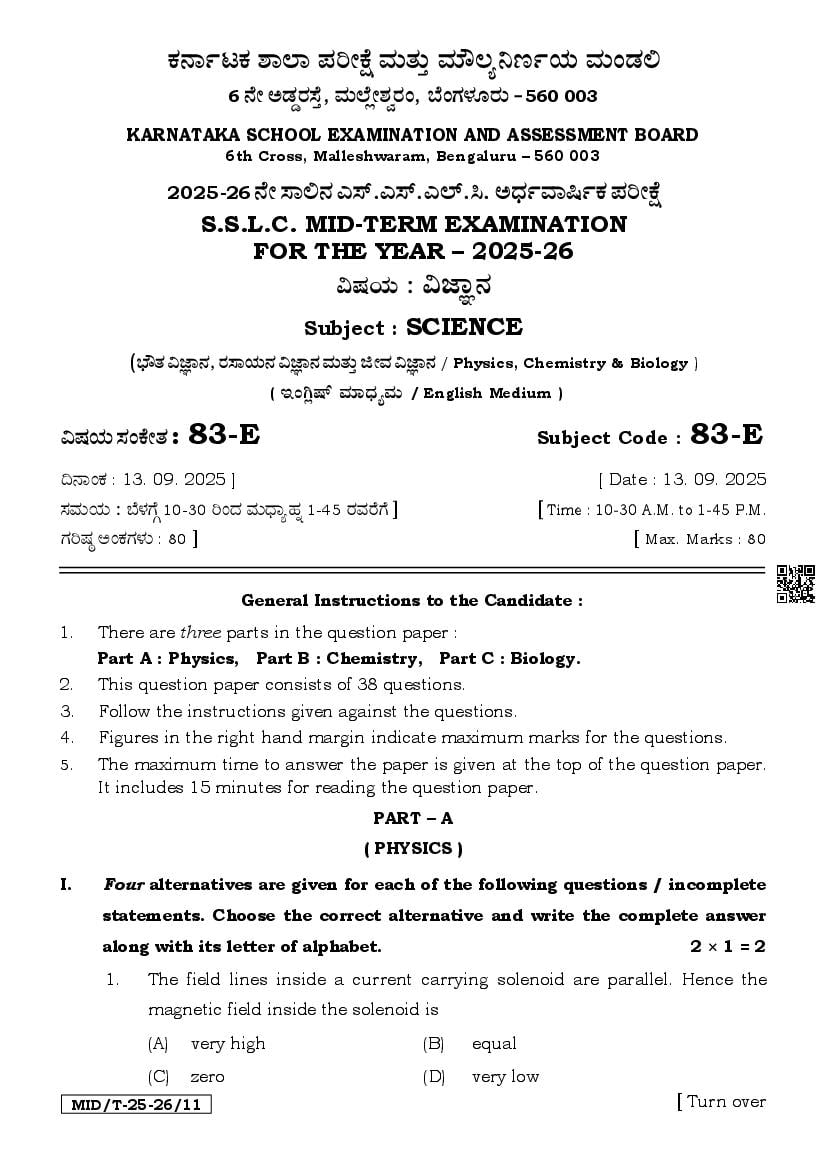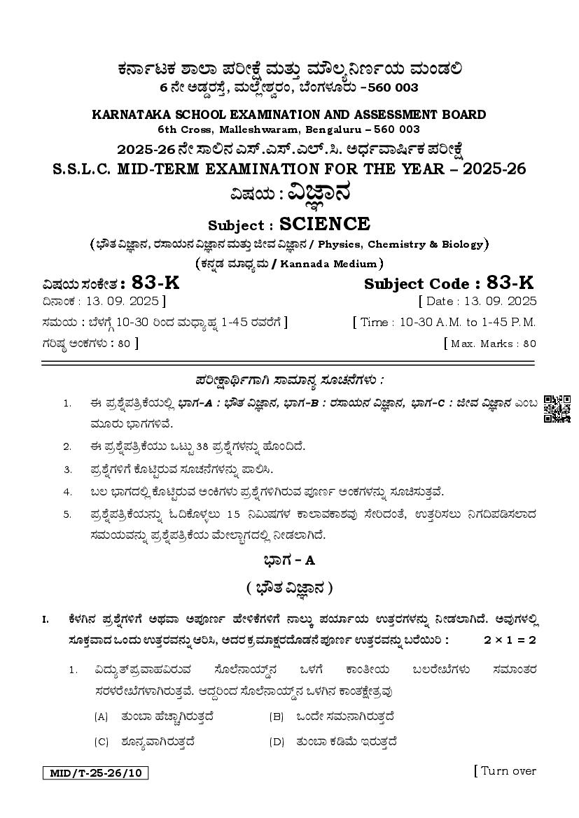 Karnataka SSLC Mid Term Question Paper 2025 Science View Download