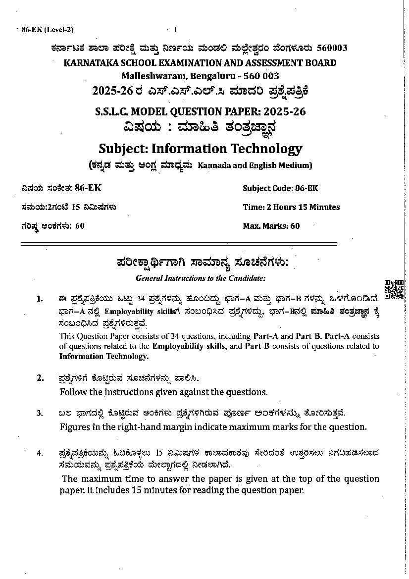 Karnataka SSLC Model Question Paper 2026 Information Technology View Download