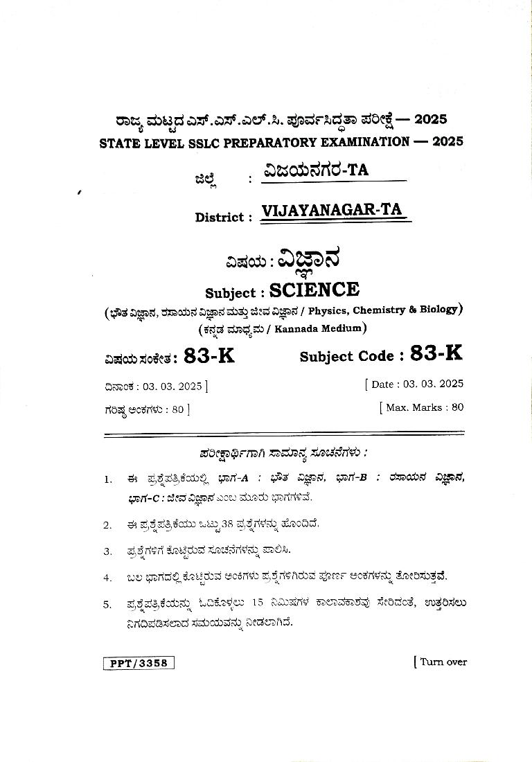 Karnataka SSLC Preparatory Exam Question Paper 2025 Science View Download