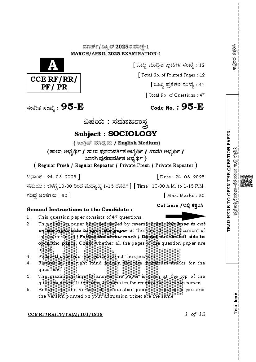 Karnataka SSLC Sociology Question Paper 2025 PDF
