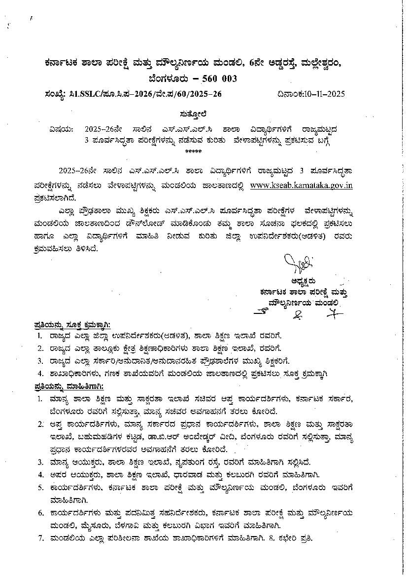 Karnataka SSLC Preparatory Exam 3 Time Table 2026 PDF Download – Click here to download the KSEAB SSLC Preparatory Exam 3 Time Table 2025-26.