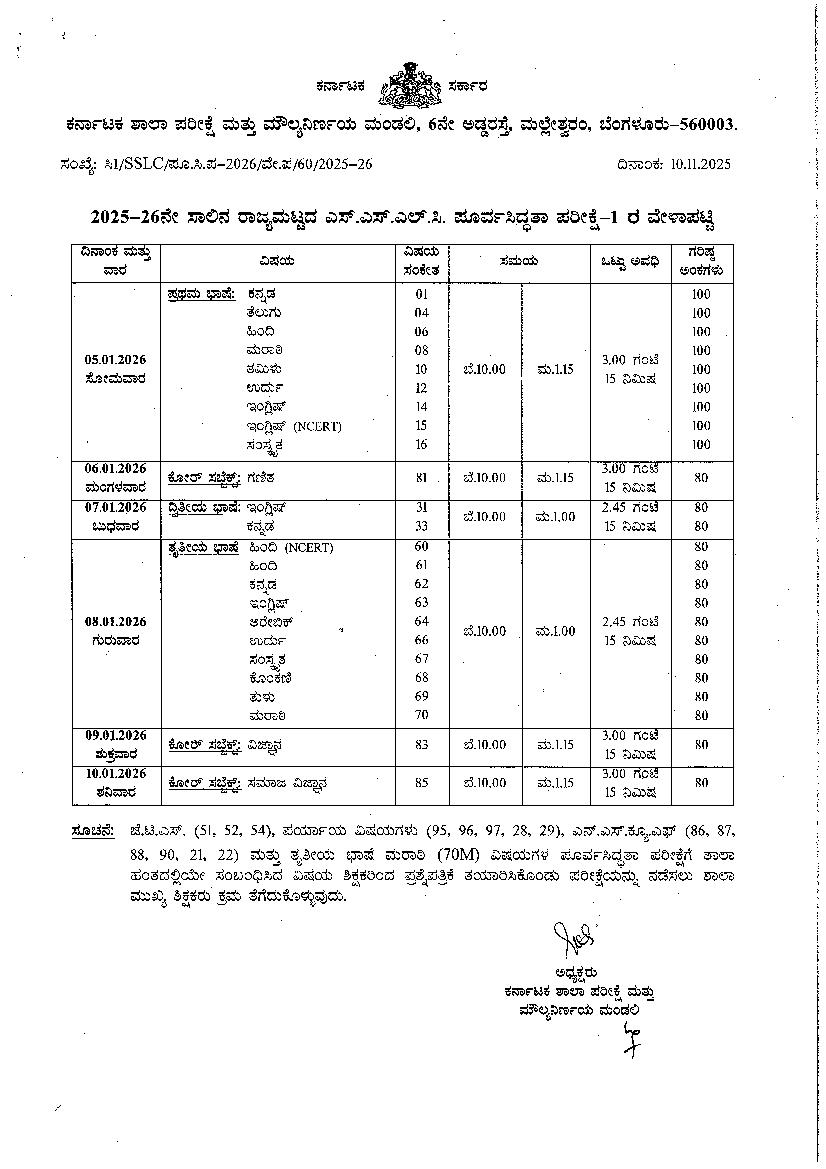 Karnataka SSLC Preparatory Time Table 2026