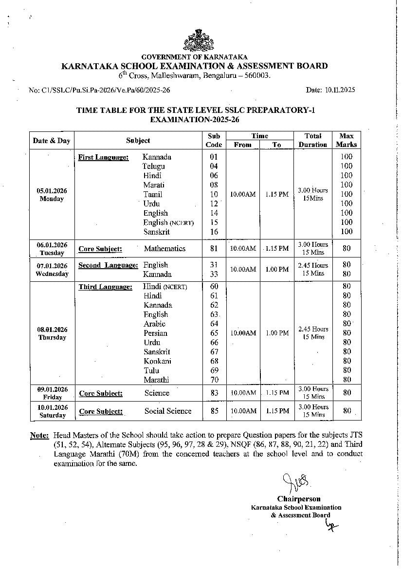 Karnataka SSLC Preparatory Exam 1 Time Table 2026 PDF Download – Click here to download the KSEAB SSLC Preparatory Exam 1 Time Table 2025-26.