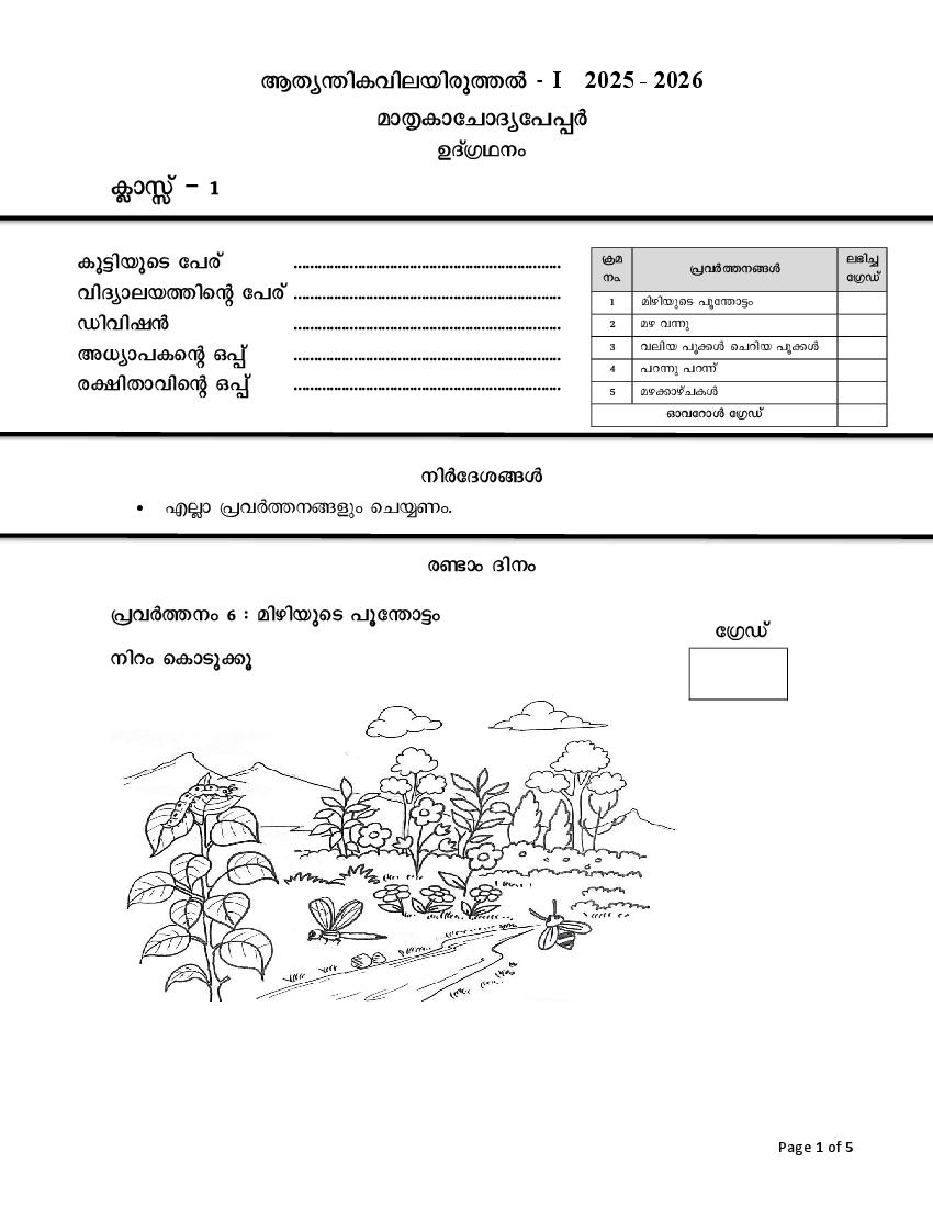 Kerala Class 1 Integration Day 1 Onam Exam Model Question Paper 2026 (First Term Exam / 1st Terminal Exam) PDF Download