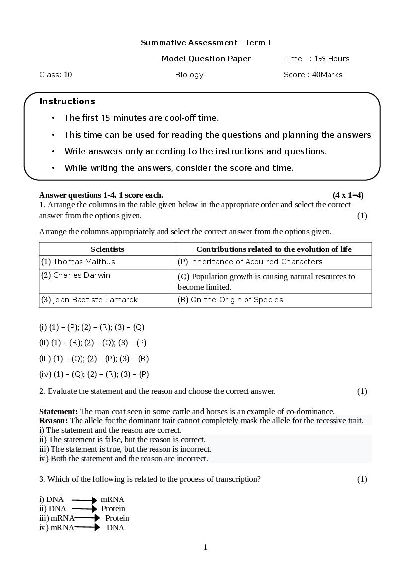 - Kerala 10th Standard Biology Sample Paper PDF