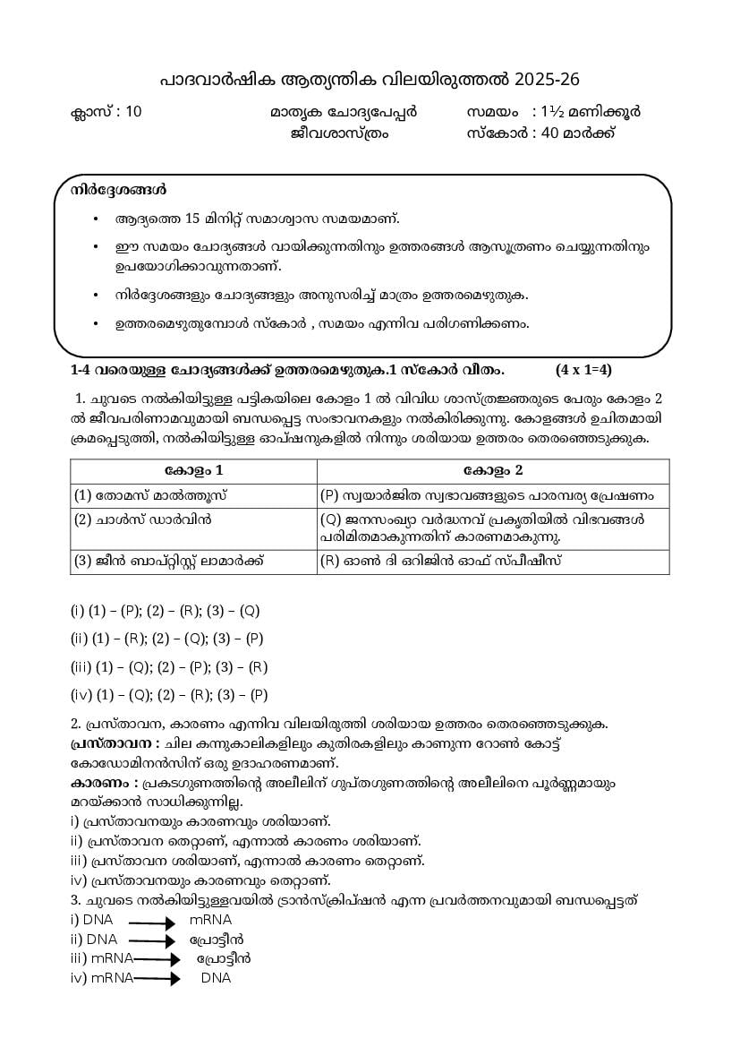 - Kerala Class 10 Biology Model Paper 2026