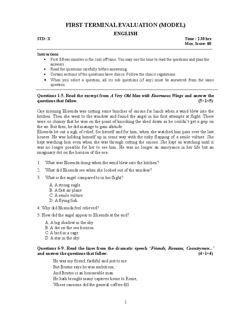 Kerala Class 10 First Term Model Question Paper 2025 English View Download