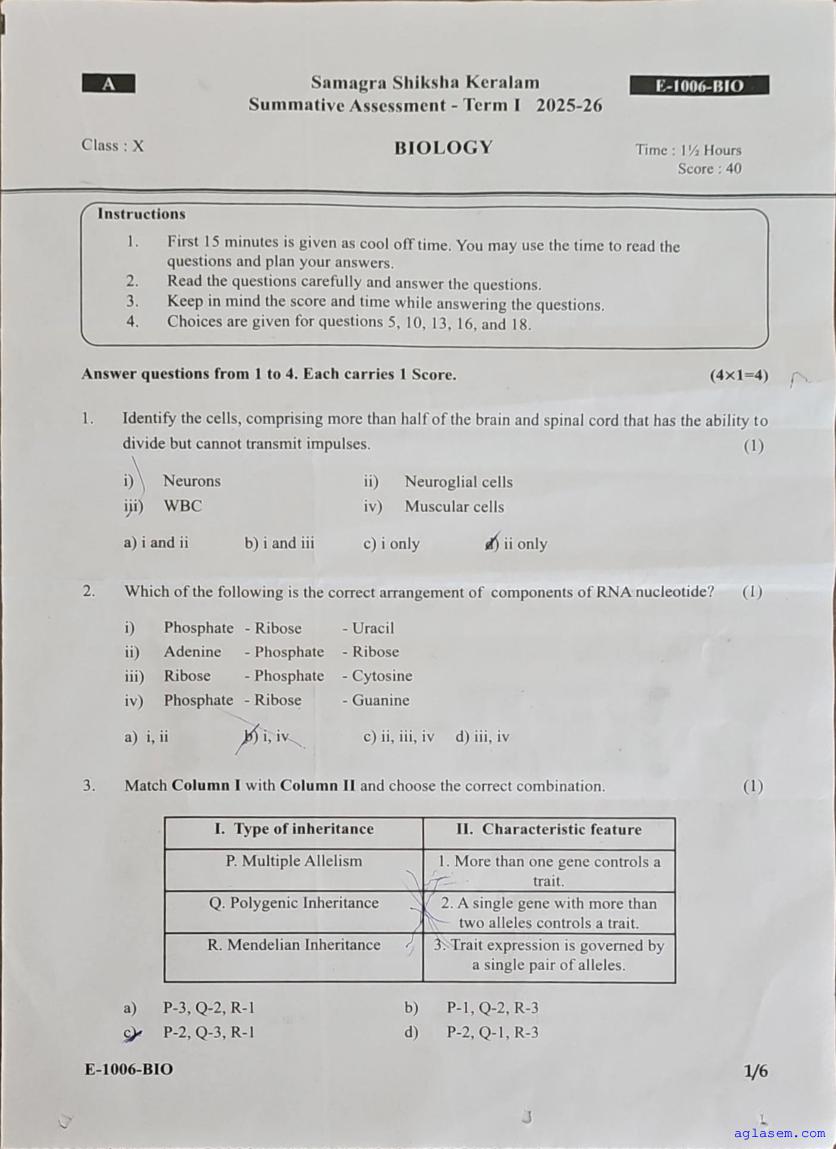 Class 10 Biology Onam Exam Question Paper 2026 is published after exam. You can download the Kerala Std 10 First Term Biology Question Paper PDF from here on aglasem. The latest and previous year question paper of Onam Exam for class 10 Biology helps you prepare for the upcoming first term Biology test. And after studying with this Kerala Syllabus SSLC Biology Question Paper, you can download Onam Exam Question Paper for Class 10 for other subjects as well.